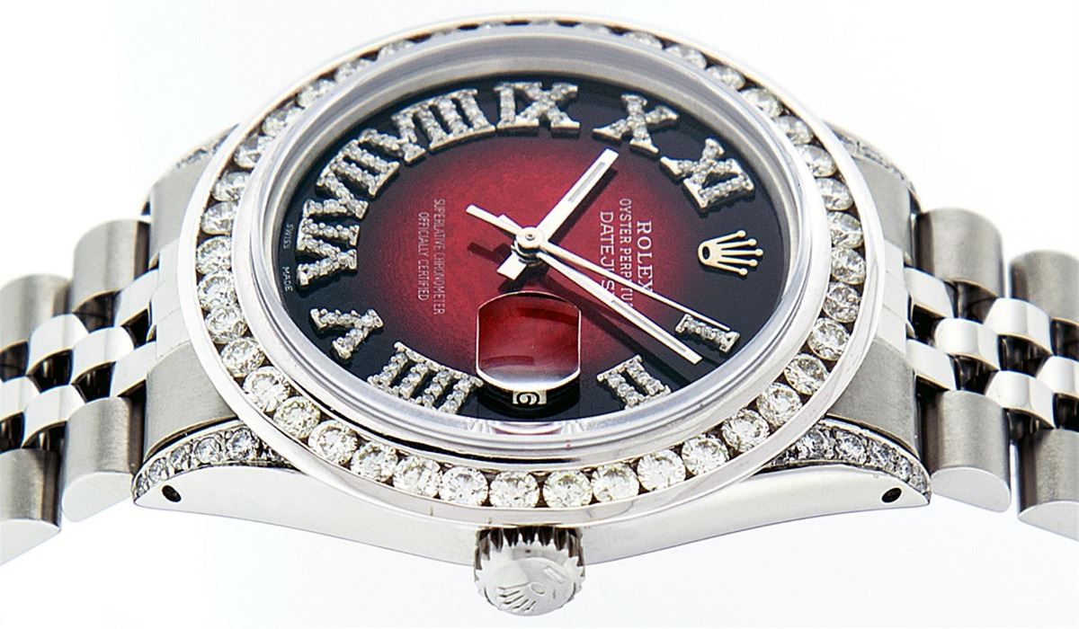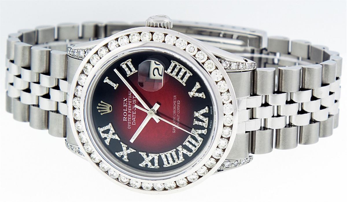 One Mens Rolex Datejust Polished Bright with Satin Finish, Serviced & Electronically Tested, Stainless Steel Case:36mm, Diamond Lugs: 24 Diamonds In Lugs, Color: G to H, Clarity: SI-VS. Stainless Steel Crown, Custom Bezel: 18K White Gold Channel Set Diamond Bezel, Diamond Count: 40 Diamonds, Total Weight 3.00 Carat, Clarity: SI-VS, Color: G to H. Custom Crystal: Synthetic Sapphire Cyclops Lens. Movement: Automatic Winding Movement Caliber 3035. Custom Dial: Red Vignette Roman Diamond Dial, Diamond Color: G To H In Color, Clarity: SI-VS. Date Window: 3 O'Clock Position Date Display, Quickset, Model: Datejust Condition: G-6 Extra Fine. Bracelet: Stainless Steel Jubilee. Bright Polish & Satin Finish. 7.0 Inch Length, Adjustable. Standard Clasp, With Rolex Logo. Comes with 6 month warranty.