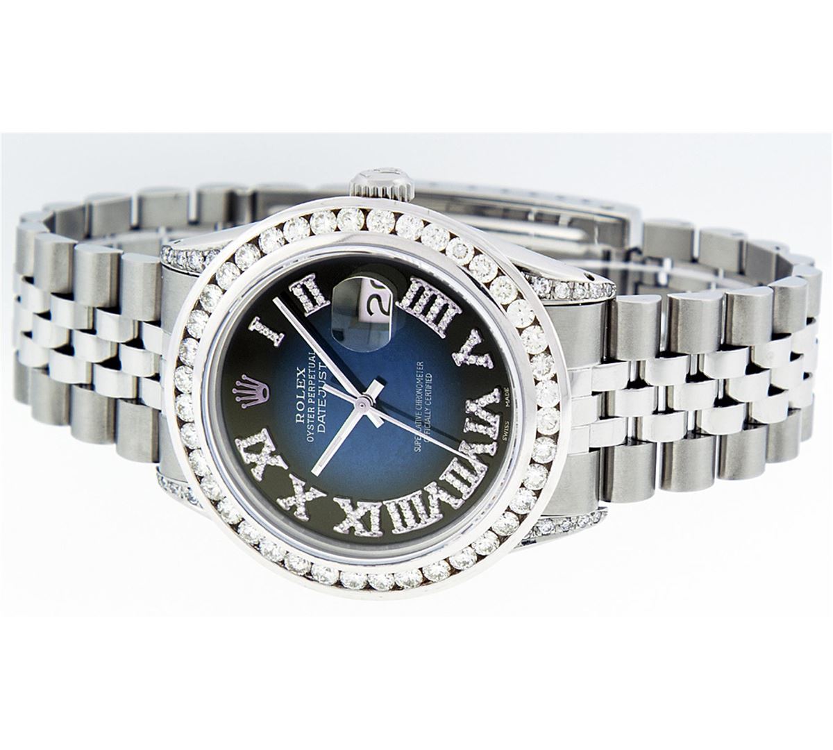 One Mens Rolex Datejust Polished Bright with Satin Finish, Serviced & Electronically Tested, Stainless Steel Case:36mm, Diamond Lugs: 24 Diamonds In Lugs, Color: G to H, Clarity: SI-VS. Stainless Steel Crown, Custom Bezel: 18K White Gold Channel Set Diamond Bezel, Diamond Count: 40 Diamonds, Total Weight 3.00 Carat, Clarity: SI-VS, Color: G to H. Custom Crystal: Synthetic Sapphire Cyclops Lens. Movement: Automatic Winding Movement Caliber 3035. Custom Dial: Blue Vignette Diamond Roman Dial, Diamond Color: G To H In Color, Clarity: SI-VS. Date Window: 3 O'Clock Position Date Display, Quickset, Model: Datejust Condition: G-6 Extra Fine. Bracelet: Stainless Steel Jubilee. Bright Polish & Satin Finish. 7.0 Inch Length, Adjustable. Standard Clasp, With Rolex Logo. Comes with 6 month warranty.