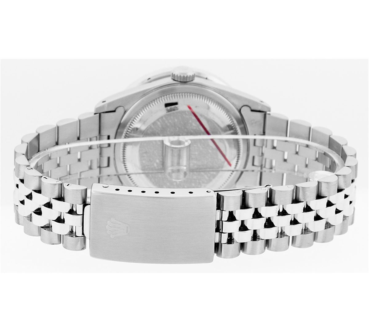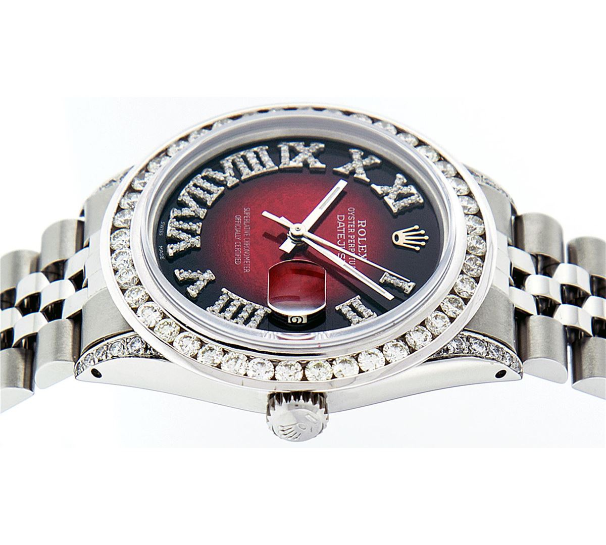 One Mens Rolex Datejust Polished Bright with Satin Finish, Serviced & Electronically Tested, Stainless Steel Case:36mm, Diamond Lugs: 24 Diamonds In Lugs, Color: G to H, Clarity: SI-VS. Stainless Steel Crown, Custom Bezel: 18K White Gold Channel Set Diamond Bezel, Diamond Count: 40 Diamonds, Total Weight 3.00 Carat, Clarity: SI-VS, Color: G to H. Custom Crystal: Synthetic Sapphire Cyclops Lens. Movement: Automatic Winding Movement Caliber 3035. Custom Dial: Red Vignette Roman Diamond Dial, Diamond Color: G To H In Color, Clarity: SI-VS. Date Window: 3 O'Clock Position Date Display, Quickset, Model: Datejust Condition: G-6 Extra Fine. Bracelet: Stainless Steel Jubilee. Bright Polish & Satin Finish. 7.0 Inch Length, Adjustable. Standard Clasp, With Rolex Logo. Comes with 6 month warranty.