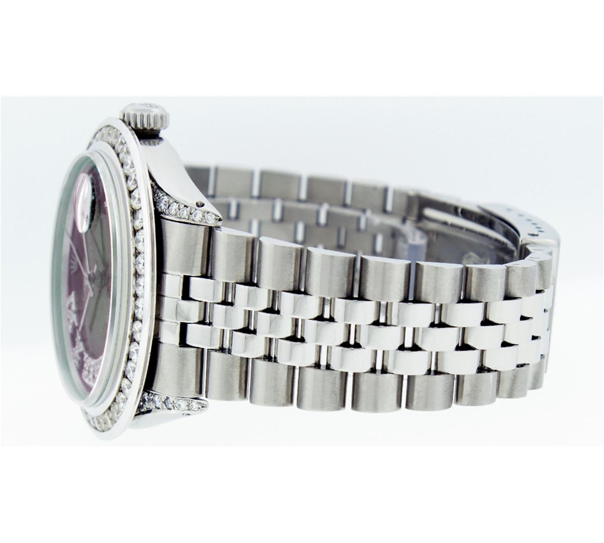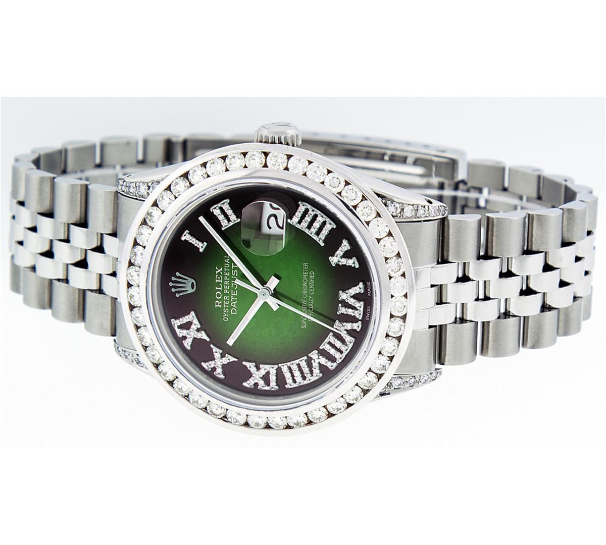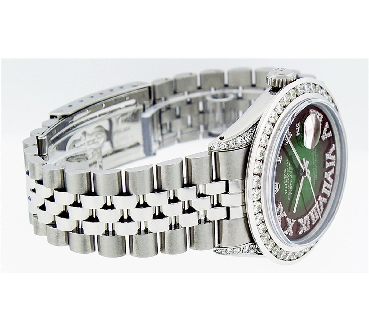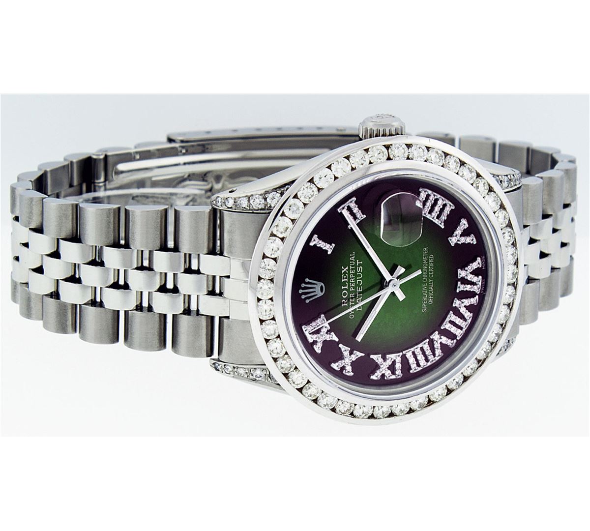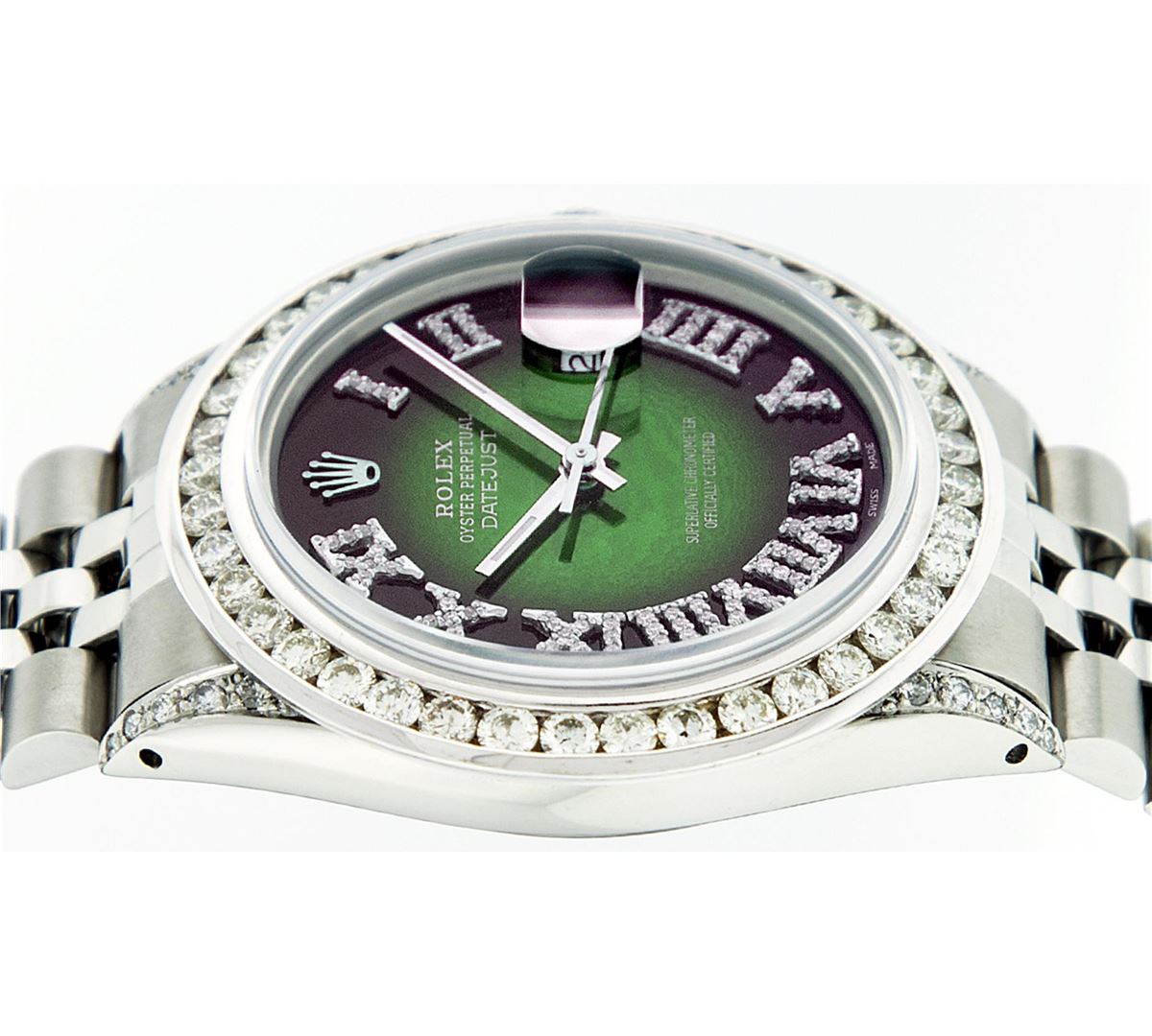 One Mens Rolex Datejust Polished Bright with Satin Finish, Serviced & Electronically Tested, Stainless Steel Case:36mm, Diamond Lugs: 24 Diamonds In Lugs, Color: G to H, Clarity: SI-VS. Stainless Steel Crown, Custom Bezel: 18K White Gold Channel Set Diamond Bezel, Diamond Count: 40 Diamonds, Total Weight 3.00 Carat, Clarity: SI-VS, Color: G to H. Custom Crystal: Synthetic Sapphire Cyclops Lens. Movement: Automatic Winding Movement Caliber 3035. Custom Dial: Green Vignette Roman Diamond Dial, Diamond Color: G To H In Color, Clarity: SI-VS. Date Window: 3 O'Clock Position Date Display, Quickset, Model: Datejust Condition: G-6 Extra Fine. Bracelet: Stainless Steel Jubilee. Bright Polish & Satin Finish. 7.0 Inch Length, Adjustable. Standard Clasp, With Rolex Logo. Comes with 6 month warranty.