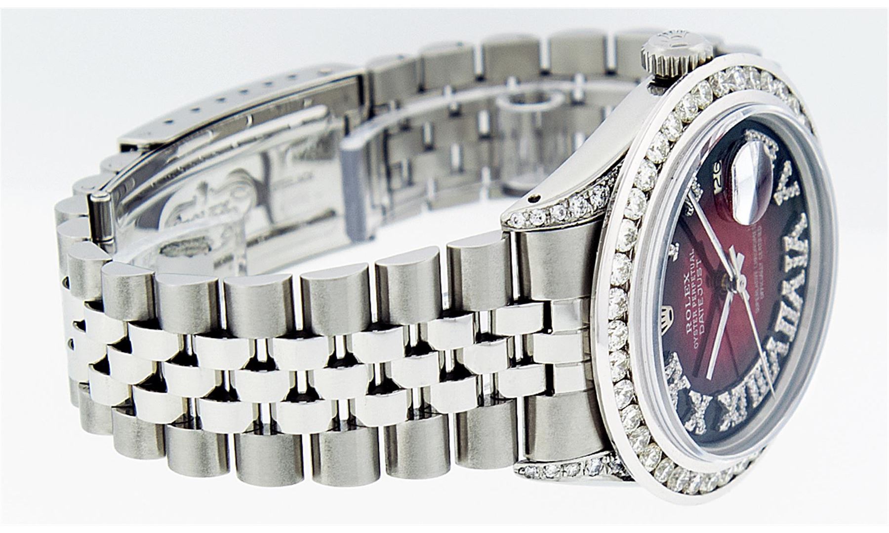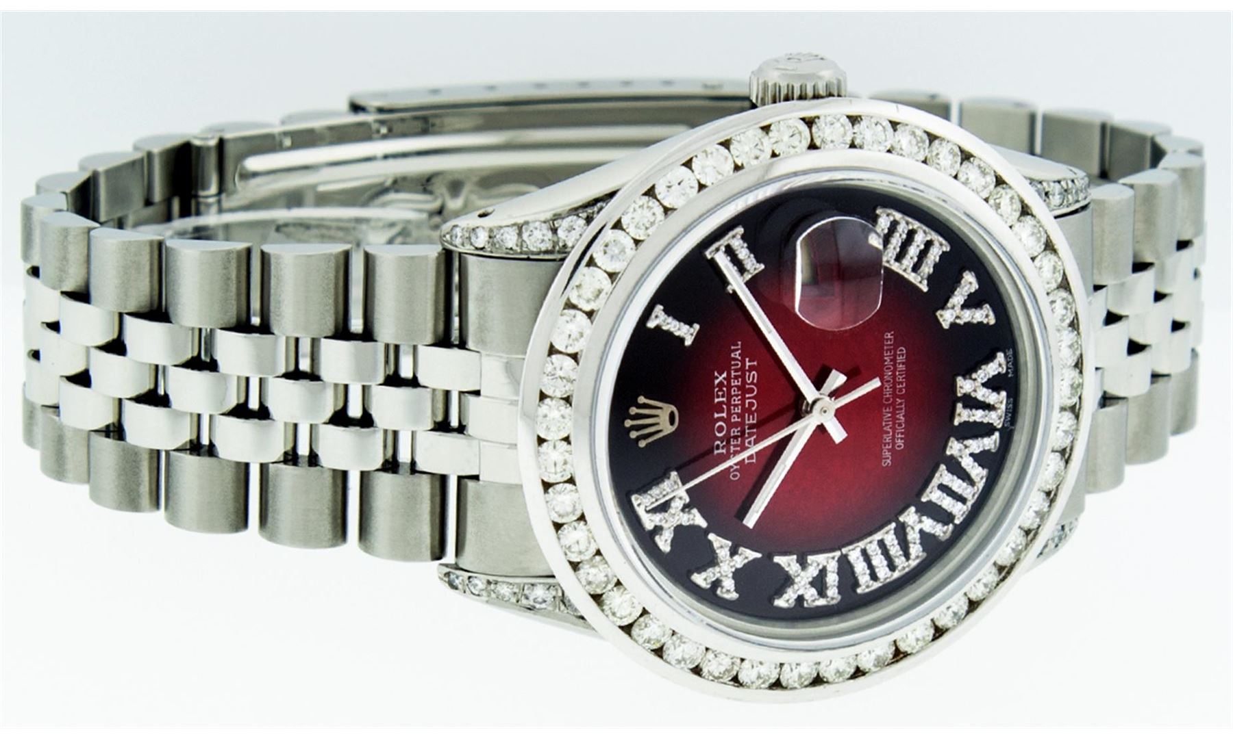One Mens Rolex Datejust Polished Bright with Satin Finish, Serviced & Electronically Tested, Stainless Steel Case:36mm, Diamond Lugs: 24 Diamonds In Lugs, Color: G to H, Clarity: SI-VS. Stainless Steel Crown, Custom Bezel: 18K White Gold Channel Set Diamond Bezel, Diamond Count: 40 Diamonds, Total Weight 3.00 Carat, Clarity: SI-VS, Color: G to H. Custom Crystal: Synthetic Sapphire Cyclops Lens. Movement: Automatic Winding Movement Caliber 3035. Custom Dial: Red Vignette Roman Diamond Dial, Diamond Color: G To H In Color, Clarity: SI-VS. Date Window: 3 O'Clock Position Date Display, Quickset, Model: Datejust Condition: G-6 Extra Fine. Bracelet: Stainless Steel Jubilee. Bright Polish & Satin Finish. 7.0 Inch Length, Adjustable. Standard Clasp, With Rolex Logo. Comes with 6 month warranty.