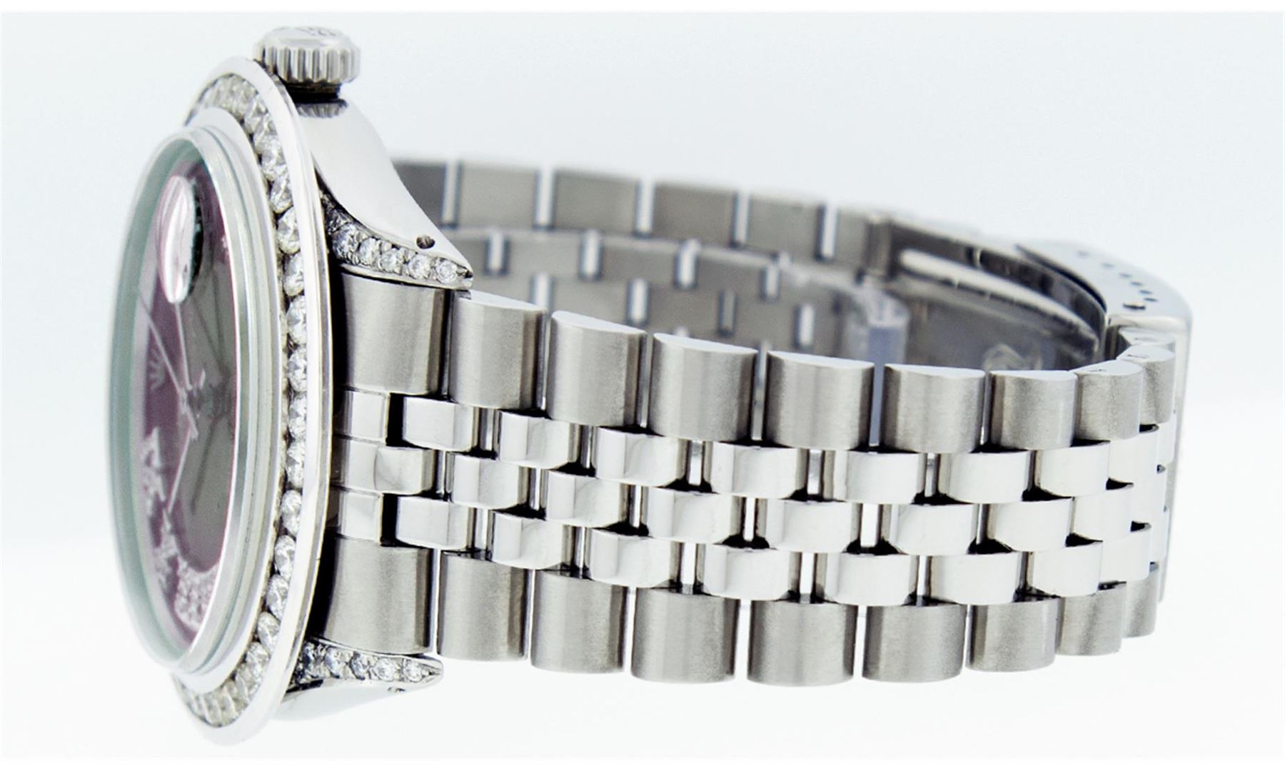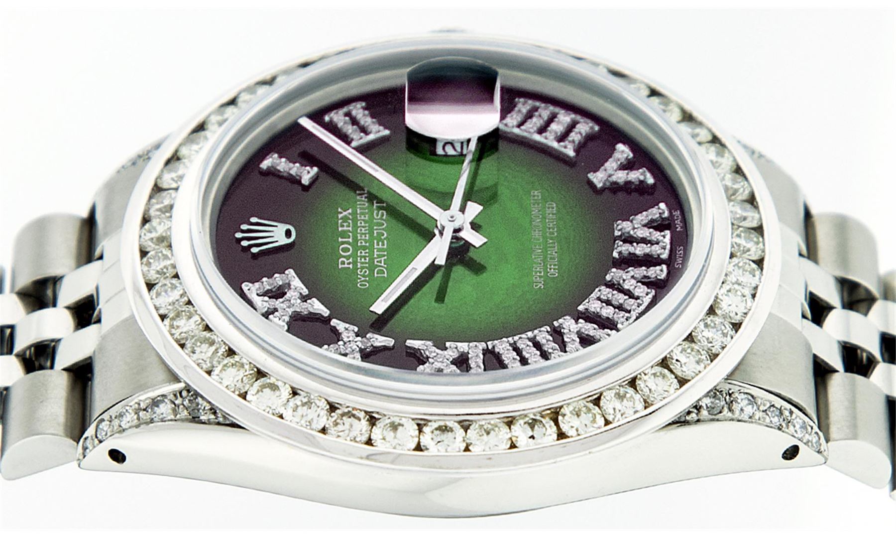 One Mens Rolex Datejust Polished Bright with Satin Finish, Serviced & Electronically Tested, Stainless Steel Case:36mm, Diamond Lugs: 24 Diamonds In Lugs, Color: G to H, Clarity: SI-VS. Stainless Steel Crown, Custom Bezel: 18K White Gold Channel Set Diamond Bezel, Diamond Count: 40 Diamonds, Total Weight 3.00 Carat, Clarity: SI-VS, Color: G to H. Custom Crystal: Synthetic Sapphire Cyclops Lens. Movement: Automatic Winding Movement Caliber 3035. Custom Dial: Green Vignette Roman Diamond Dial, Diamond Color: G To H In Color, Clarity: SI-VS. Date Window: 3 O'Clock Position Date Display, Quickset, Model: Datejust Condition: G-6 Extra Fine. Bracelet: Stainless Steel Jubilee. Bright Polish & Satin Finish. 7.0 Inch Length, Adjustable. Standard Clasp, With Rolex Logo. Comes with 6 month warranty.