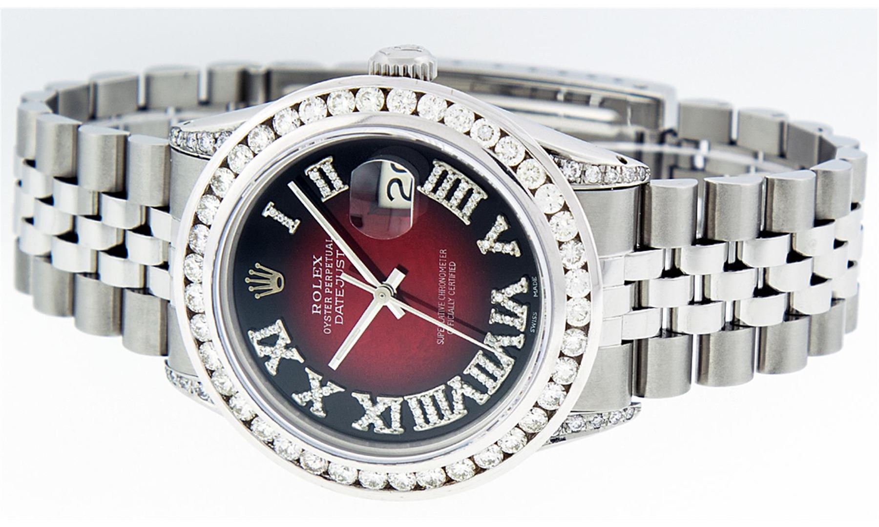 One Mens Rolex Datejust Polished Bright with Satin Finish, Serviced & Electronically Tested, Stainless Steel Case:36mm, Diamond Lugs: 24 Diamonds In Lugs, Color: G to H, Clarity: SI-VS. Stainless Steel Crown, Custom Bezel: 18K White Gold Channel Set Diamond Bezel, Diamond Count: 40 Diamonds, Total Weight 3.00 Carat, Clarity: SI-VS, Color: G to H. Custom Crystal: Synthetic Sapphire Cyclops Lens. Movement: Automatic Winding Movement Caliber 3035. Custom Dial: Red Vignette Roman Diamond Dial, Diamond Color: G To H In Color, Clarity: SI-VS. Date Window: 3 O'Clock Position Date Display, Quickset, Model: Datejust Condition: G-6 Extra Fine. Bracelet: Stainless Steel Jubilee. Bright Polish & Satin Finish. 7.0 Inch Length, Adjustable. Standard Clasp, With Rolex Logo. Comes with 6 month warranty.