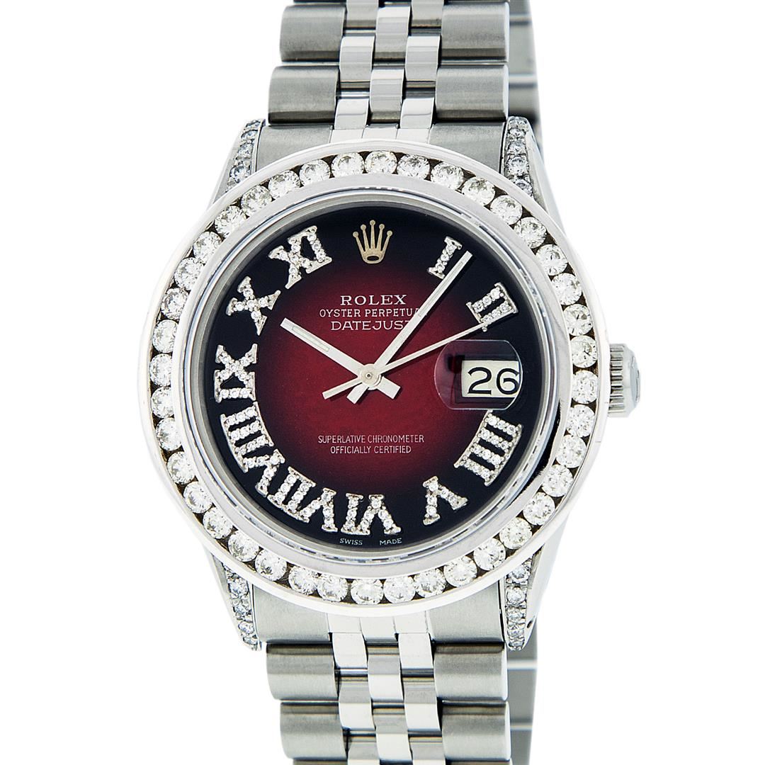 One Mens Rolex Datejust Polished Bright with Satin Finish, Serviced & Electronically Tested, Stainless Steel Case:36mm, Diamond Lugs: 24 Diamonds In Lugs, Color: G to H, Clarity: SI-VS. Stainless Steel Crown, Custom Bezel: 18K White Gold Channel Set Diamond Bezel, Diamond Count: 40 Diamonds, Total Weight 3.00 Carat, Clarity: SI-VS, Color: G to H. Custom Crystal: Synthetic Sapphire Cyclops Lens. Movement: Automatic Winding Movement Caliber 3035. Custom Dial: Red Vignette Roman Diamond Dial, Diamond Color: G To H In Color, Clarity: SI-VS. Date Window: 3 O'Clock Position Date Display, Quickset, Model: Datejust Condition: G-6 Extra Fine. Bracelet: Stainless Steel Jubilee. Bright Polish & Satin Finish. 7.0 Inch Length, Adjustable. Standard Clasp, With Rolex Logo. Comes with 6 month warranty.