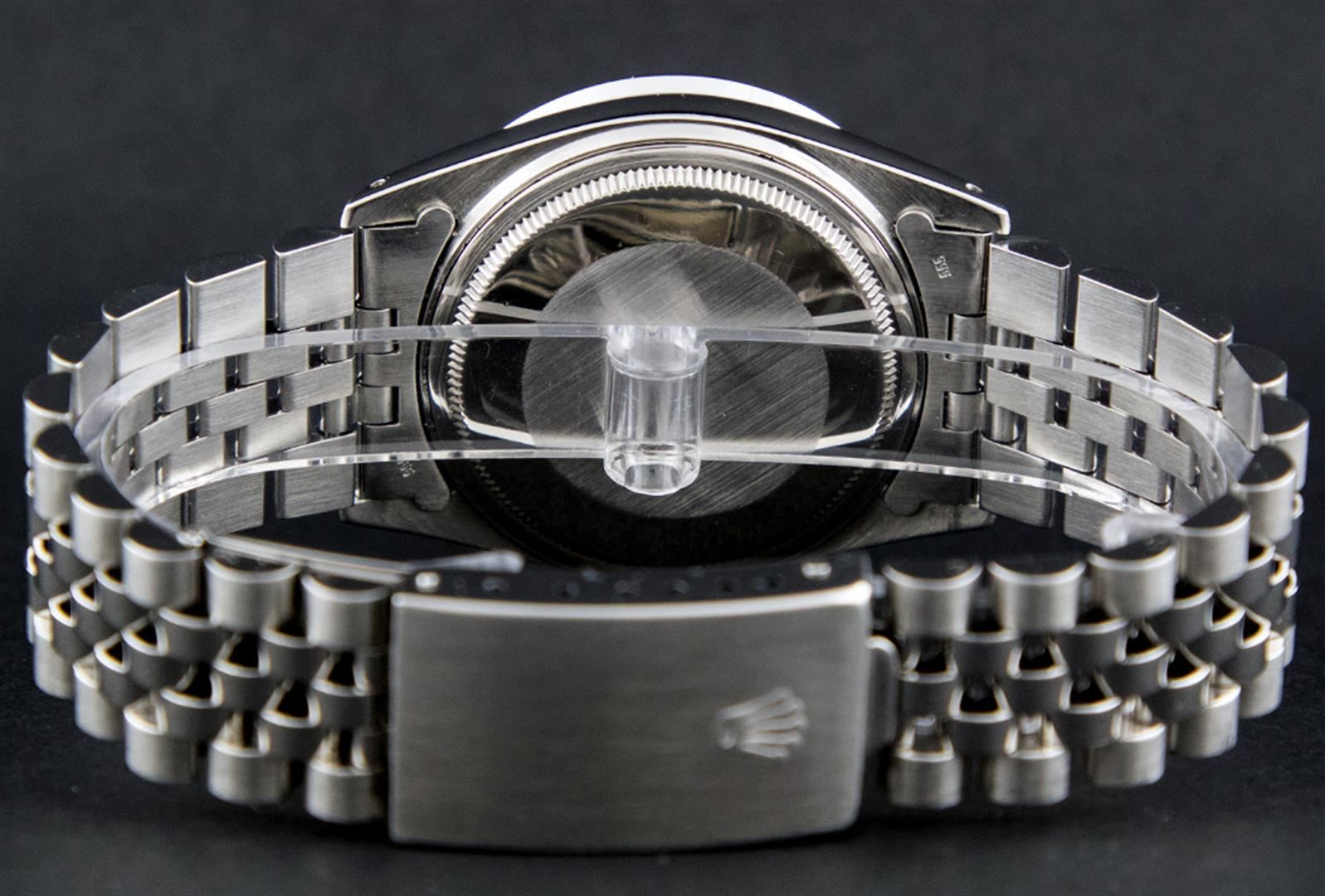 One Mens Stainless Steel Rolex Datejust Polished Bright with Satin Finish, Serviced & Electronically Tested, Stainless Steel Case: 36mm, Stainless Steel Crown, Custom Bezel: New 18K White Gold Pyramid Diamond Bezel, Diamond Count: 24 Diamonds, Total Weight .70 Carat, Clarity: SI-VS, Color: G to H. Custom Crystal: New Synthetic Sapphire Cyclops Lens. Custom Hands: New Luminescent Hands. Movement: Automatic Winding Movement. Custom Dial: Blue Index Dial. Date Window: 3 O'Clock Position Date Display, Quickset, Model: Datejust. Condition: G-6 Extra Fine. Bracelet: Stainless Steel Jubilee. Bright Polish & Satin Finish. 7.0 Inch Length, Adjustable. Standard Clasp, With Rolex Logo. This Watch Has Been Serviced Time Tested And Is In Excellent Condition It Is Free Of All Scratches And Dents