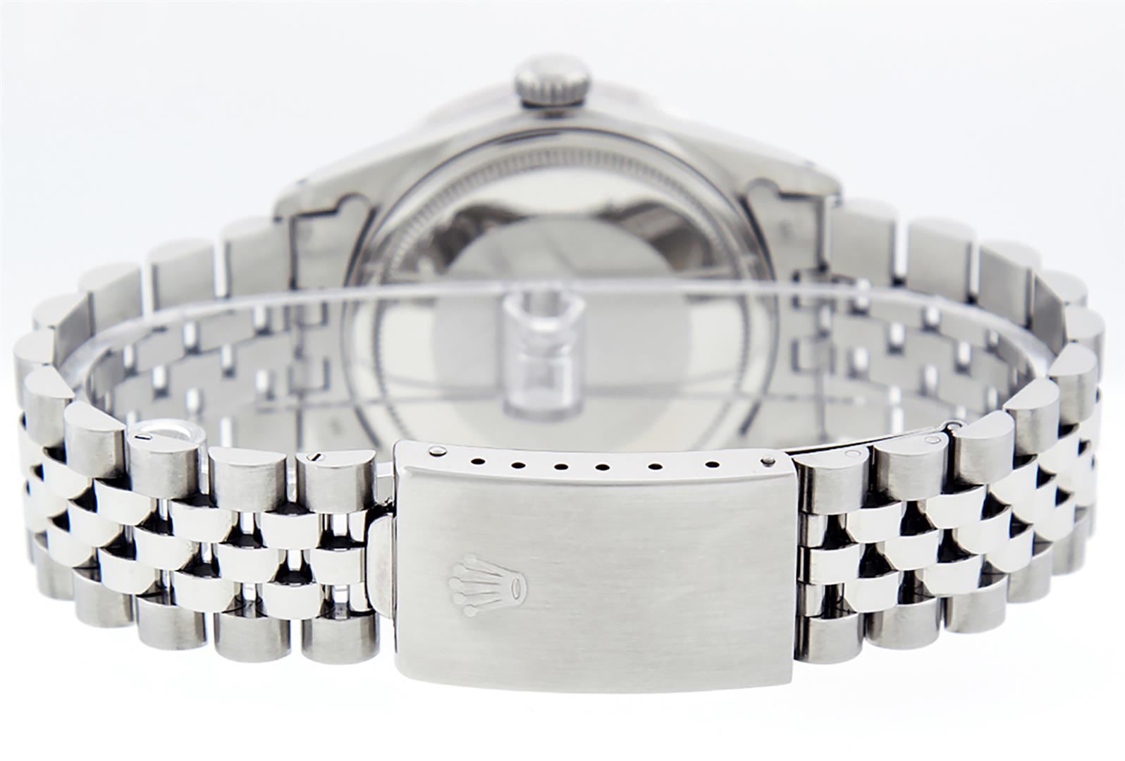 One Mens Stainless Steel Rolex Datejust Polished Bright with Satin Finish, Serviced & Electronically Tested, Stainless Steel Case: 36mm, Stainless Steel Crown, Custom Bezel: New 18K White Gold Pyramid Diamond Bezel, Diamond Count: 24 Diamonds, Total Weight .70 Carat, Clarity: SI-VS, Color: G to H. Custom Crystal: New Synthetic Sapphire Cyclops Lens. Custom Hands: New Luminescent Hands. Movement: Automatic Winding Movement. Custom Dial: Blue Index Dial. Date Window: 3 O'Clock Position Date Display, Quickset, Model: Datejust. Condition: G-6 Extra Fine. Bracelet: Stainless Steel Jubilee. Bright Polish & Satin Finish. 7.0 Inch Length, Adjustable. Standard Clasp, With Rolex Logo. This Watch Has Been Serviced Time Tested And Is In Excellent Condition It Is Free Of All Scratches And Dents.