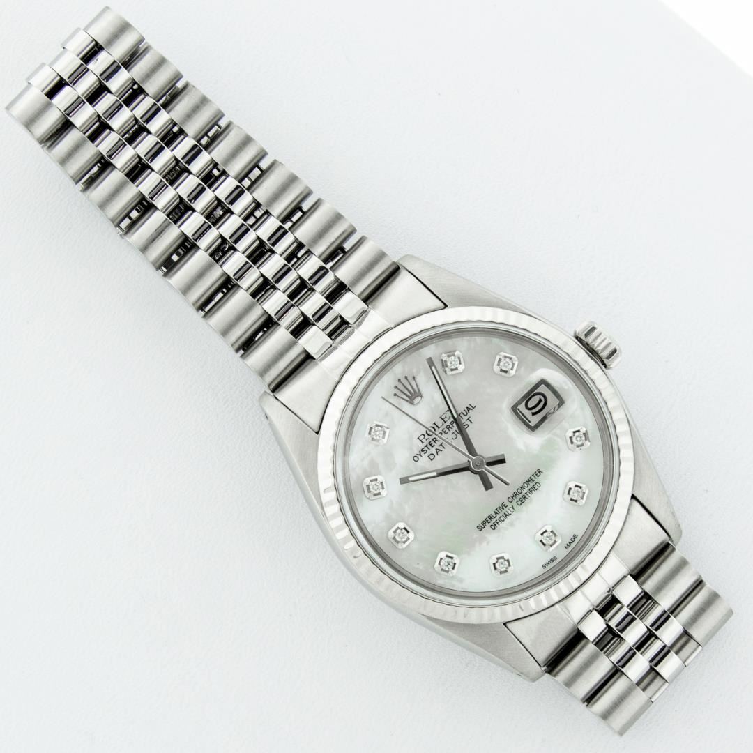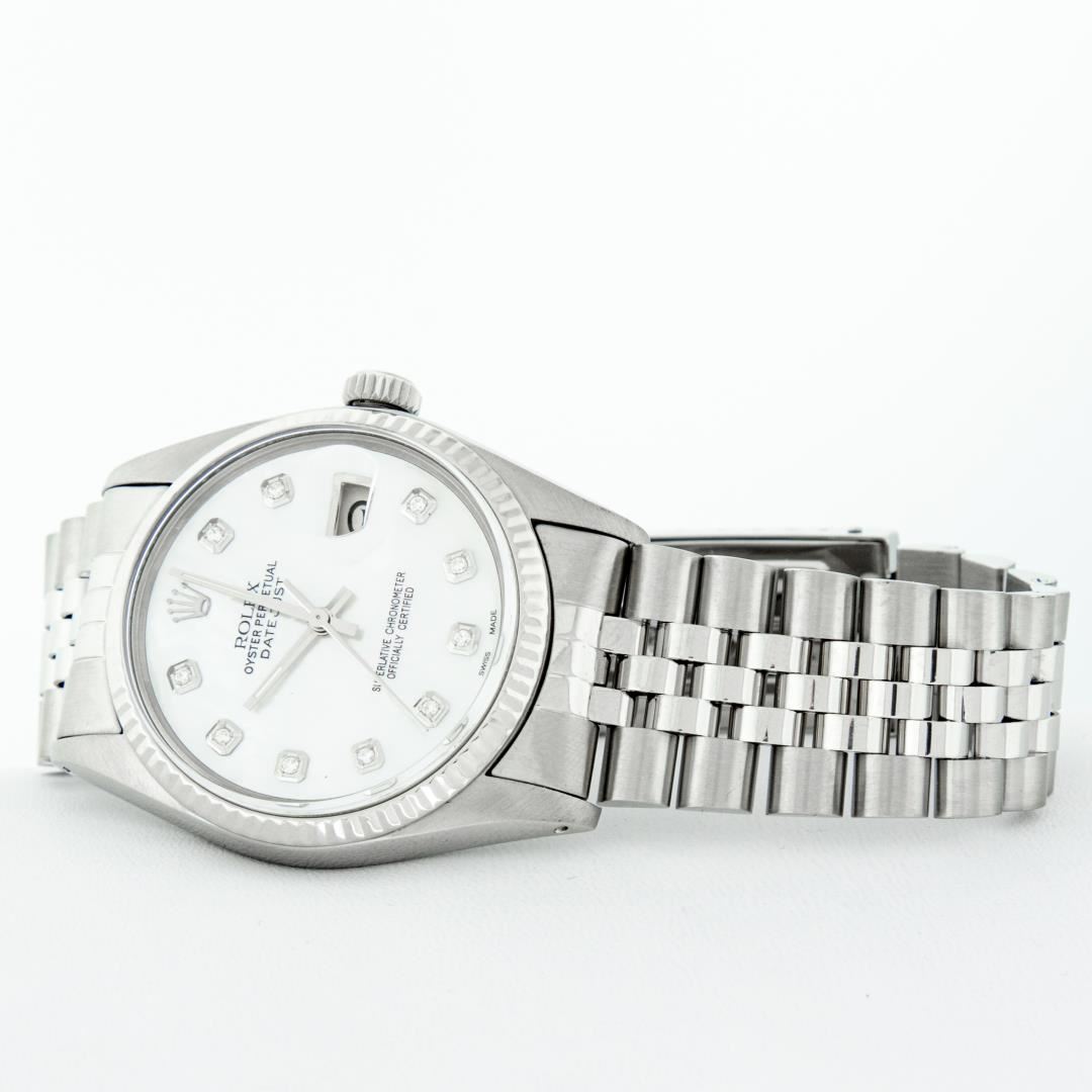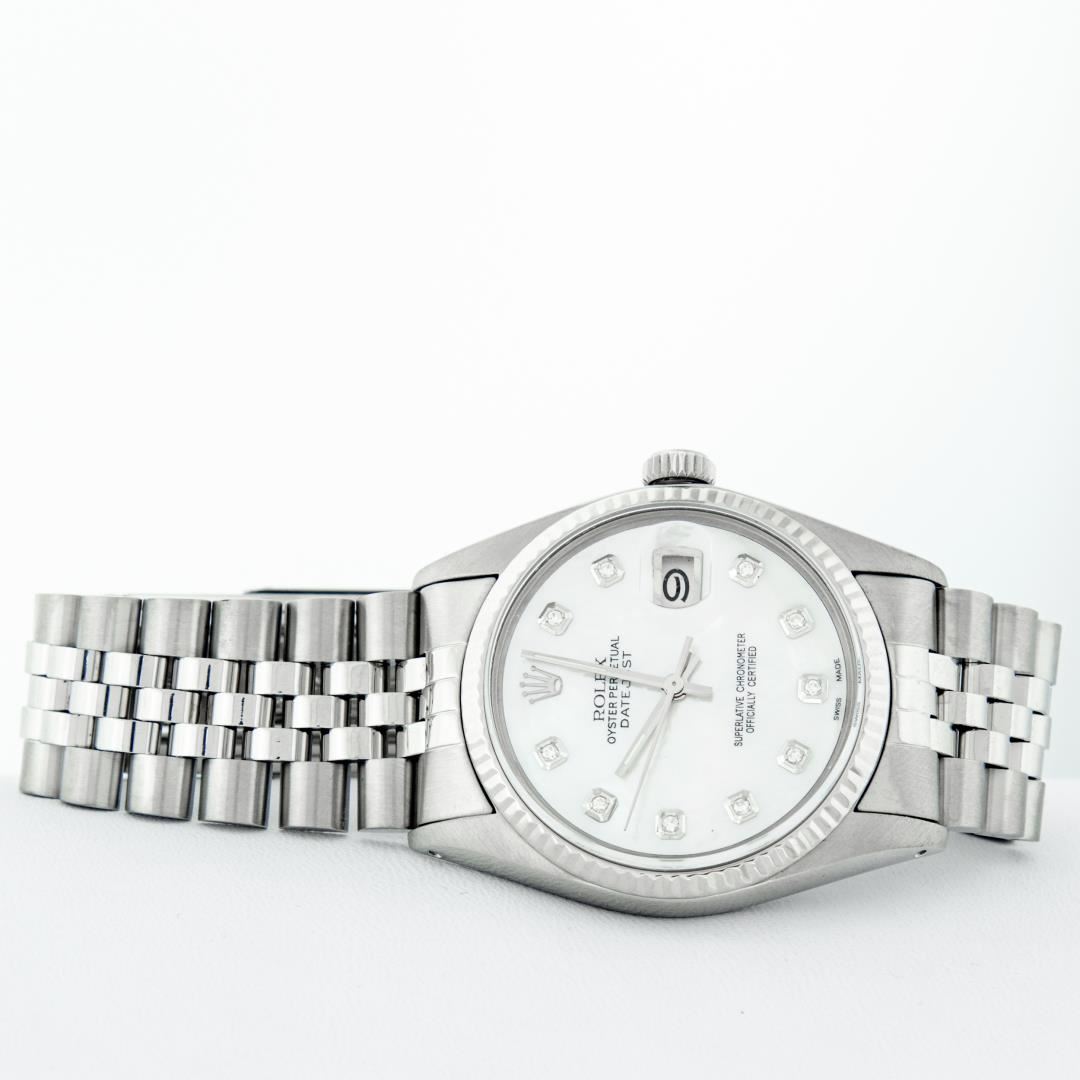 One Mens 36MM Stainless Steel Rolex Datejust Polished Bright with Satin Finish, This Watch Has Been Serviced & Electronically Tested, Rolex Stainless Steel Case: 36mm, Rolex Stainless Steel Crown, Rolex Bezel: 14K White Gold Fluted Bezel. Custom Crystal: New Acrylic With Magnified Date Window. Custom Hands: New Luminescent Hands. Rolex Movement: Automatic Winding Movement 3035. Custom Dial: Custom White Diamond Dial With Added Diamond Hour Markers, Diamond Count: 10 Diamonds On Dial. Date Window: 3 O'Clock Position Date Display, Quickset, Model: Datejust, Condition: G-6 Extra Fine. Rolex Bracelet: Stainless Steel Jubilee Band. Bright Polish & Satin Finish. 7.0 Inch Length, Adjustable. Fold Clasp, With Rolex Logo. This Watch Has Been Serviced Time Tested And Is In Excellent Condition It Is Free Of All Scratches And Dents.