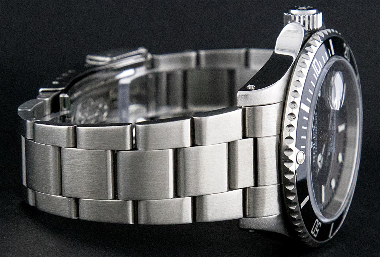One Mens Pre Owned Rolex Stainless Steel Submariner With Date Polished, Serviced & Electronically Tested, Rolex Stainless Steel Case: 40mm, Rolex Stainless Steel Crown, Rolex Bezel: Stainless Steel Rotatable Bezel With Black Insert. Crystal: Sapphire With Magnified Date Window. Rolex Movement: Automatic Winding Movement Caliber 3135. Rolex Dial: Black Submariner Dial, Hands: Submariner Hands. Date Window: 3 O'Clock Position Date Display, Model: Submariner, Quickset, Condition: G-6 Extra Fine. Rolex Bracelet: Stainless Steel Oyster Band. Bright Polish & Satin Finish. 7.0 Inch Length, Adjustable. Standard Clasp, With Rolex Logo.