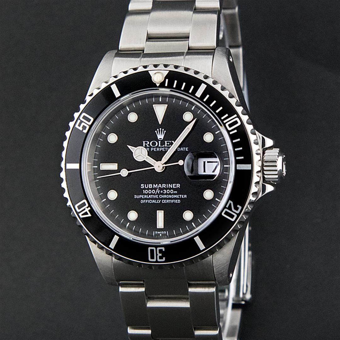 One Mens Pre Owned Rolex Stainless Steel Submariner With Date Polished, Serviced & Electronically Tested, Rolex Stainless Steel Case: 40mm, Rolex Stainless Steel Crown, Rolex Bezel: Stainless Steel Rotatable Bezel With Black Insert. Crystal: Sapphire With Magnified Date Window. Rolex Movement: Automatic Winding Movement Caliber 3135. Rolex Dial: Black Submariner Dial, Hands: Submariner Hands. Date Window: 3 O'Clock Position Date Display, Model: Submariner, Quickset, Condition: G-6 Extra Fine. Rolex Bracelet: Stainless Steel Oyster Band. Bright Polish & Satin Finish. 7.0 Inch Length, Adjustable. Standard Clasp, With Rolex Logo.