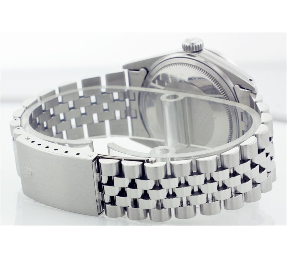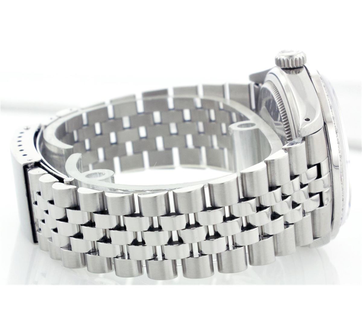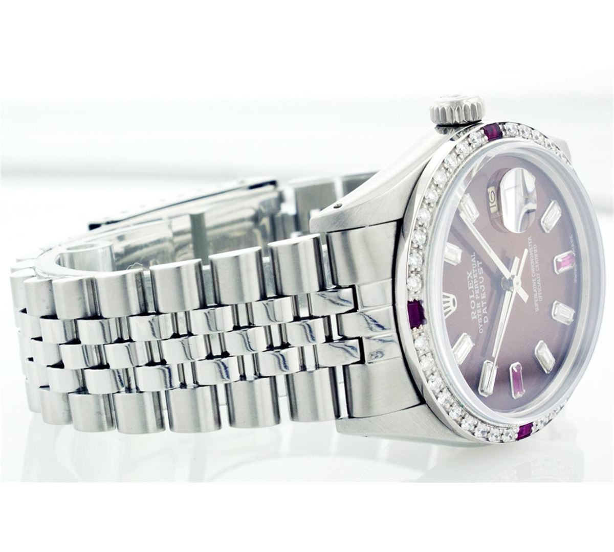 One Mens Rolex Datejust Polished Bright with Satin Finish, Serviced & Electronically Tested, Stainless Steel Case:36mm, Stainless Steel Crown, Custom Bezel: 18K White Gold Ruby Beadset Diamond Bezel, Diamond + Gem Count: 36 Diamonds + 4 Rubies Total Weight 1.00 Carat, Clarity: SI-VS, Color: G to H. Custom Crystal: Synthetic Sapphire Cyclops Lens. Movement: Automatic Winding Movement Caliber 3035. Custom Dial: Chocolate With Baguette Hour Markers, 8 Diamond Baguettes + 2 Ruby Baguettes in Dial, Dial Weight: .40 Carat, G To H In Color, Clarity: SI-VS. Date Window: 3 O'Clock Position Date Display, Quickset, Model: 16014 Condition: G-6 Extra Fine. Bracelet: Stainless Steel Jubilee. Bright Polish & Satin Finish. 6.5 Inch Length, Adjustable. Standard Clasp, With Rolex Logo.