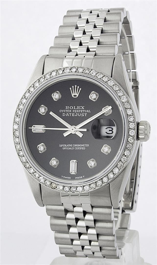 One Mens Rolex Datejust Polished Bright with Satin Finish, Serviced & Electronically Tested, Stainless Steel Case:36mm, Stainless Steel Crown, Custom Bezel: Stainless Steel Beadset Diamond Bezel, Diamond Count: 54 Diamonds Total Weight .90 Carat, Clarity: SI-VS, Color: G to H. Custom Crystal: Synthetic Sapphire Cyclops Lens. Movement: Automatic Winding Movement Caliber 3035. Custom Dial: Black Diamond 8 + 2, Diamond Count: 8 Diamonds + 2 Baguettes, Diamond Color: G to H, VS2 Si1. Date Window: 3 O'Clock Position Date Display, Quickset, Model: Datejust. Condition: G-6 Extra Fine. Bracelet: Stainless Steel Jubilee. Bright Polish & Satin Finish. 7.0 Inch Length, Adjustable. Standard Clasp, With Rolex Logo.