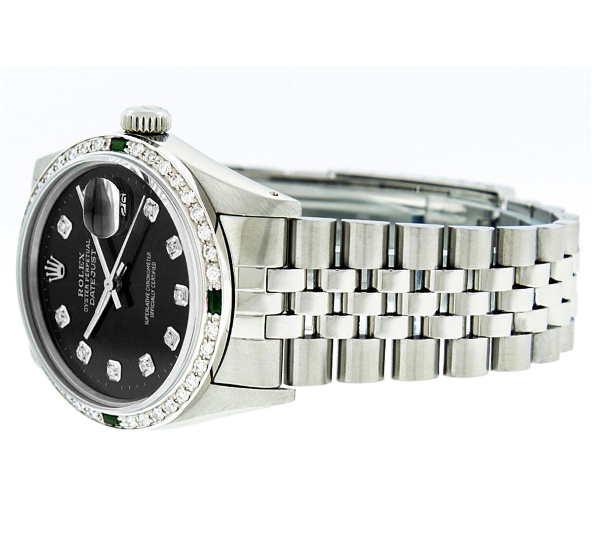 One Mens Rolex Datejust Polished Bright with Satin Finish, Serviced & Electronically Tested, Stainless Steel Case:36mm, Stainless Steel Crown, Custom Bezel: 18K White Gold Emerald Beadset Diamond Bezel, Diamond + Gem Count: 36 Diamonds + 4 Emeralds. Total Weight 1.00 Carat, Clarity: Si-VS, Color: G to H. Custom Crystal: Synthetic Sapphire Cyclops Lens. Movement: Automatic Winding Movement Caliber 3035. Custom Dial: Black Diamond Dial With Line Track, 10 Diamond in Dial G To H In Color, Si-VS Clarity. Date Window: 3 O'Clock Position Date Display, Quickset, Model: Datejust. Condition: G-6 Extra Fine. Bracelet: Stainless Steel Jubilee. Bright Polish & Satin Finish. 7.0 Inch Length, Adjustable. Standard Clasp, With Rolex Logo. Comes with a 6 month warranty card.