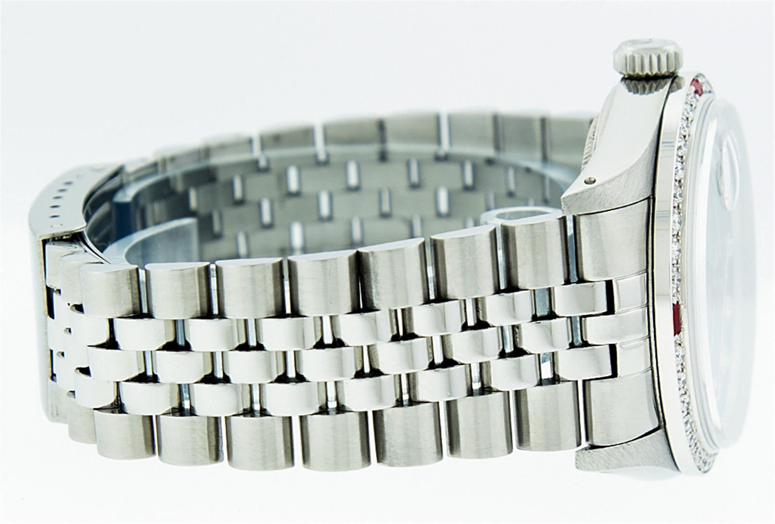 One Mens Rolex Datejust Polished Bright with Satin Finish, Serviced & Electronically Tested, Stainless Steel Case:36mm, Stainless Steel Crown, Custom Bezel: 18K White Gold Ruby Beadset Diamond Bezel, Diamond + Gem Count: 36 Diamonds + 4 Rubies. Total Weight 1.00 Carat, Clarity: Si-VS, Color: G to H. Custom Crystal: Synthetic Sapphire Cyclops Lens. Movement: Automatic Winding Movement Caliber 3035. Custom Dial: Black Diamond Dial, 10 Diamond in Dial G To H In Color, Si-VS Clarity. Date Window: 3 O'Clock Position Date Display, Quickset, Model: Datejust. Condition: G-6 Extra Fine. Bracelet: Stainless Steel Jubilee. Bright Polish & Satin Finish. 7.0 Inch Length, Adjustable. Standard Clasp, With Rolex Logo. Comes with a 6 month warranty card.