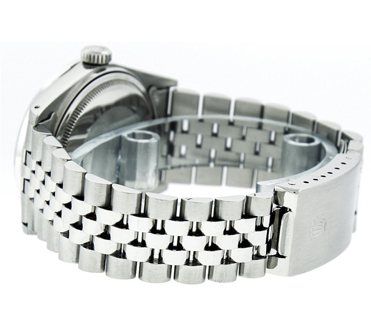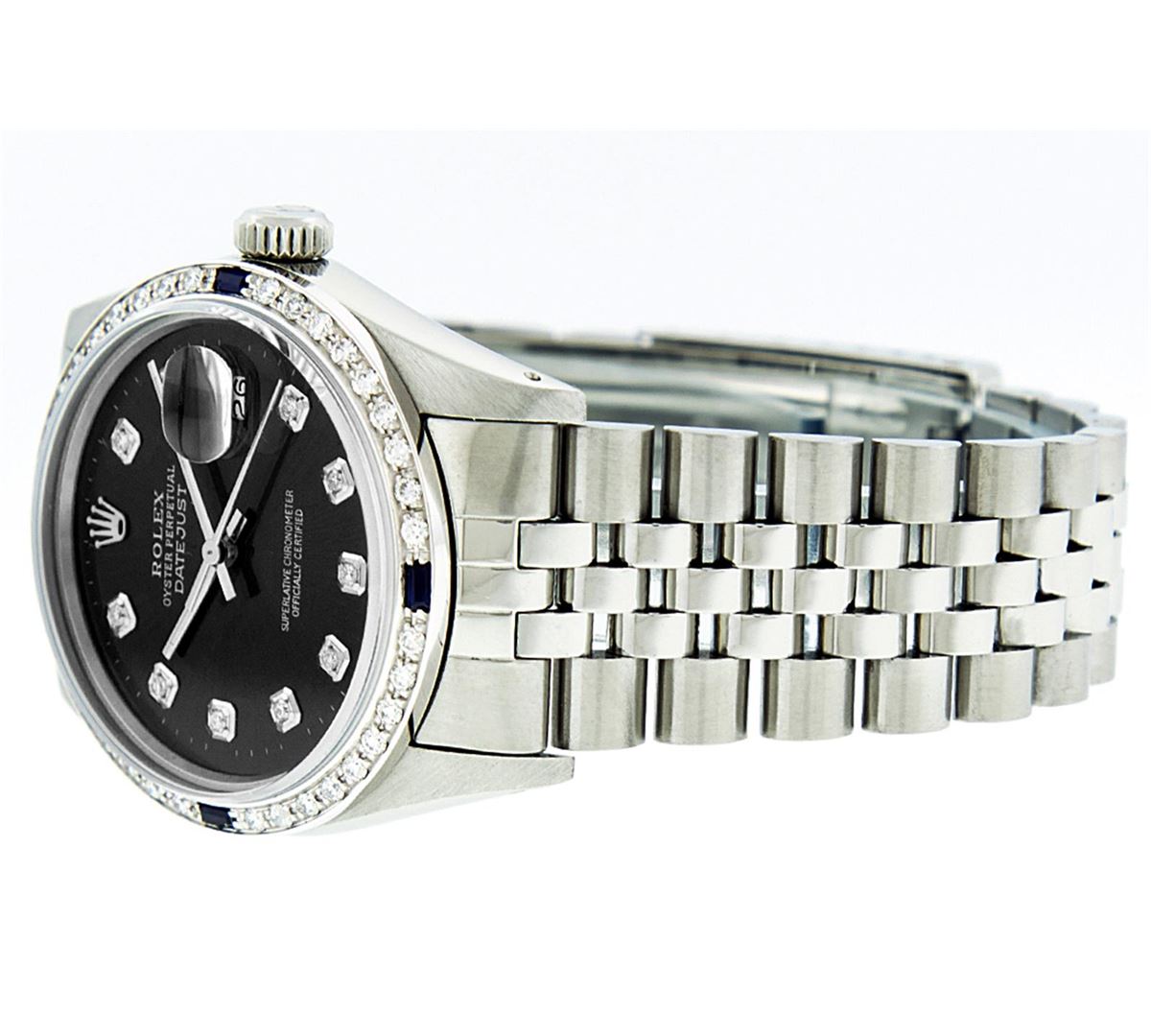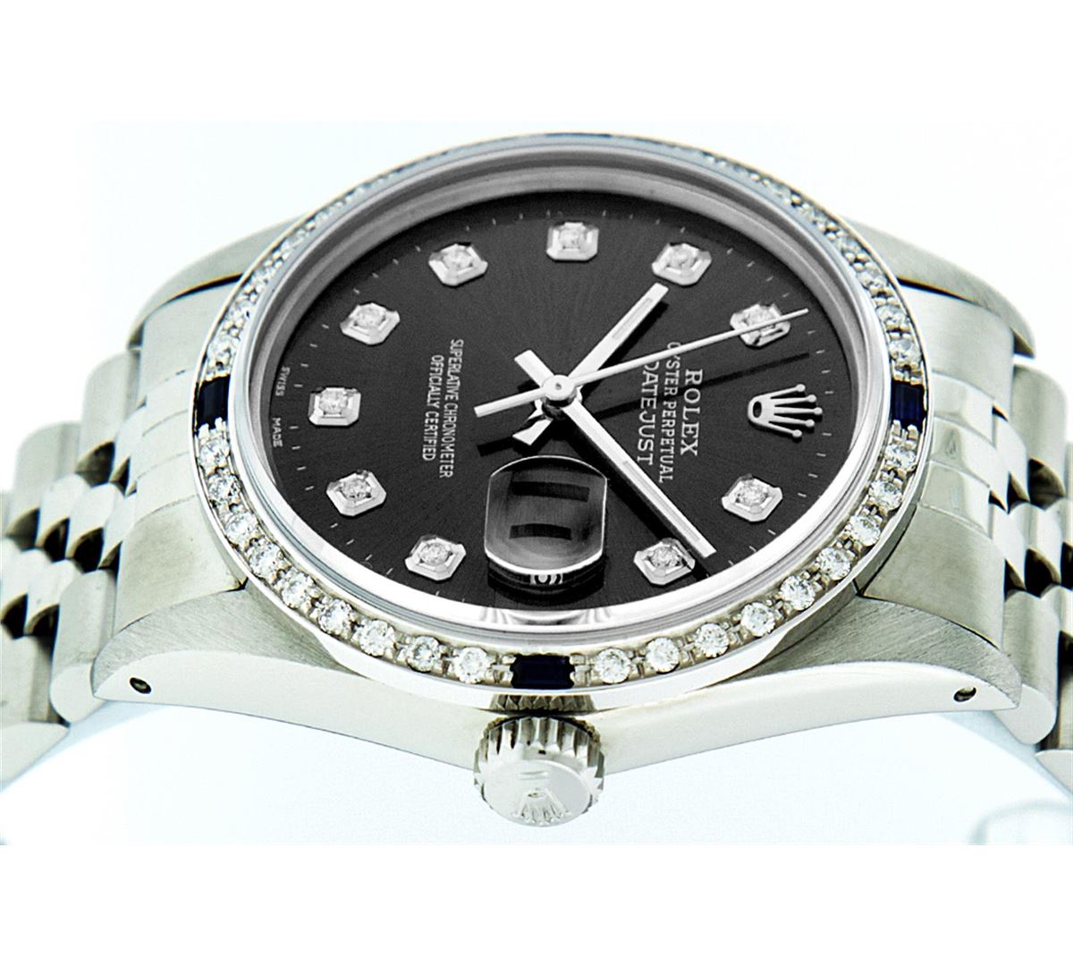 One Mens Rolex Datejust Polished Bright with Satin Finish, Serviced & Electronically Tested, Stainless Steel Case:36mm, Stainless Steel Crown, Custom Bezel: 18K White Gold Sapphire Beadset Diamond Bezel, Diamond + Gem Count: 36 Diamonds + 4 Sapphires. Total Weight 1.00 Carat, Clarity: Si-VS, Color: G to H. Custom Crystal: Synthetic Sapphire Cyclops Lens. Movement: Automatic Winding Movement Caliber 3035. Custom Dial: Black Diamond Dial, 10 Diamond in Dial G To H In Color, Si-VS Clarity. Date Window: 3 O'Clock Position Date Display, Quickset, Model: Datejust. Condition: G-6 Extra Fine. Bracelet: Stainless Steel Jubilee. Bright Polish & Satin Finish. 7.0 Inch Length, Adjustable. Standard Clasp, With Rolex Logo. Comes with a 6 month warranty card.