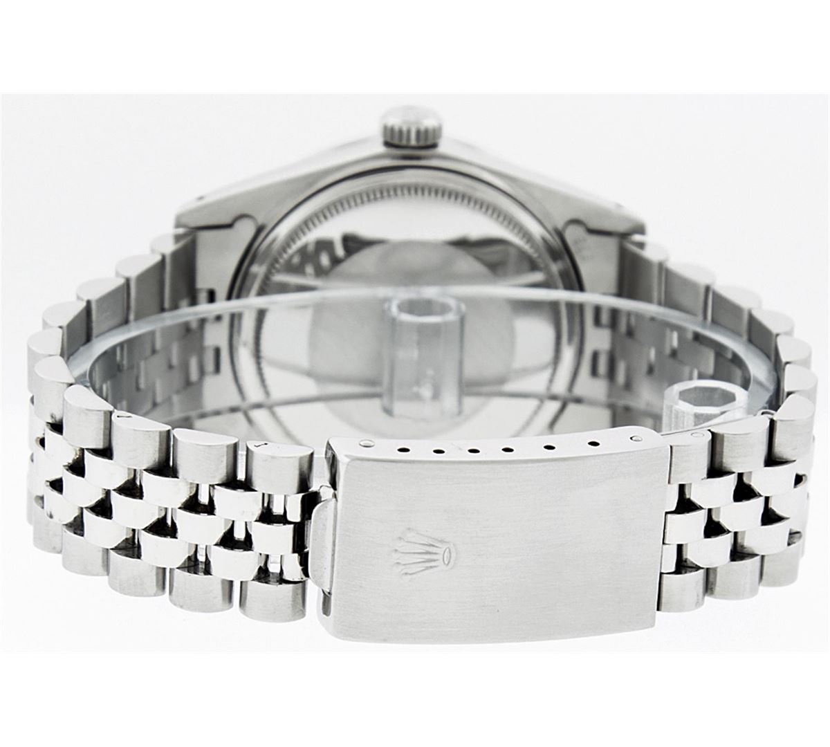 One Mens Rolex Datejust Polished Bright with Satin Finish, Serviced & Electronically Tested, Stainless Steel Case:36mm, Stainless Steel Crown, Custom Bezel: 18K White Gold Sapphire Beadset Diamond Bezel, Diamond + Gem Count: 36 Diamonds + 4 Sapphires. Total Weight 1.00 Carat, Clarity: Si-VS, Color: G to H. Custom Crystal: Synthetic Sapphire Cyclops Lens. Movement: Automatic Winding Movement Caliber 3035. Custom Dial: Black Diamond Dial, 10 Diamond in Dial G To H In Color, Si-VS Clarity. Date Window: 3 O'Clock Position Date Display, Quickset, Model: Datejust. Condition: G-6 Extra Fine. Bracelet: Stainless Steel Jubilee. Bright Polish & Satin Finish. 7.0 Inch Length, Adjustable. Standard Clasp, With Rolex Logo. Comes with a 6 month warranty card.
