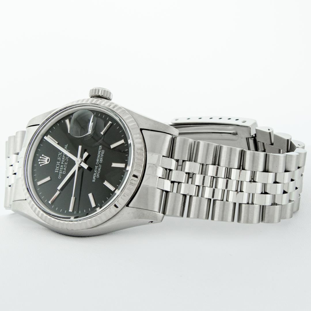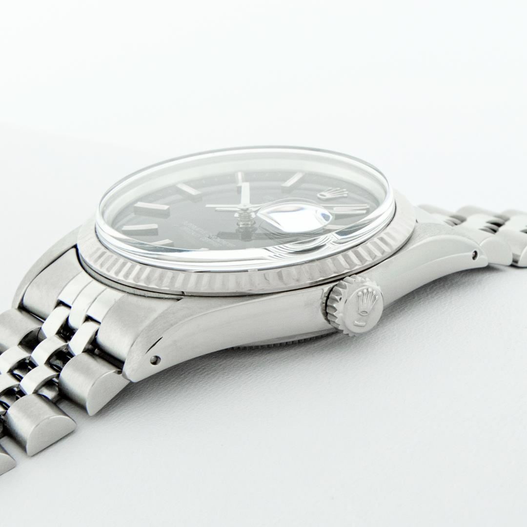 One Mens Pre Owned Stainless Steel Rolex 36MM Datejust Polished, Serviced And Electronically Tested, Rolex Stainless Steel Case: 36mm, Rolex Stainless Steel Crown, Rolex Bezel: White Gold Fluted Bezel. Custom Crystal: New AcrylicWith Magnified Date Window. Custom Hands: New Luminescent Hands. Rolex Movement: Automatic Winding Movement 3035. Custom Dial: Custom Black Dial With Index Hour Markers With Line Track. Date Window: 3 O'Clock Position Date Display, Quickset, Model: Quickset Datejust, Condition: G-6 Extra Fine. Rolex Bracelet: Stainless Steel Jubilee Band. Bright Polish & Satin Finish. 7.0 Inch Length, Adjustable. Fold Clasp, With Rolex Logo. Watch Has Been Serviced And Polished It Is Free Of All Scratches And Dents.