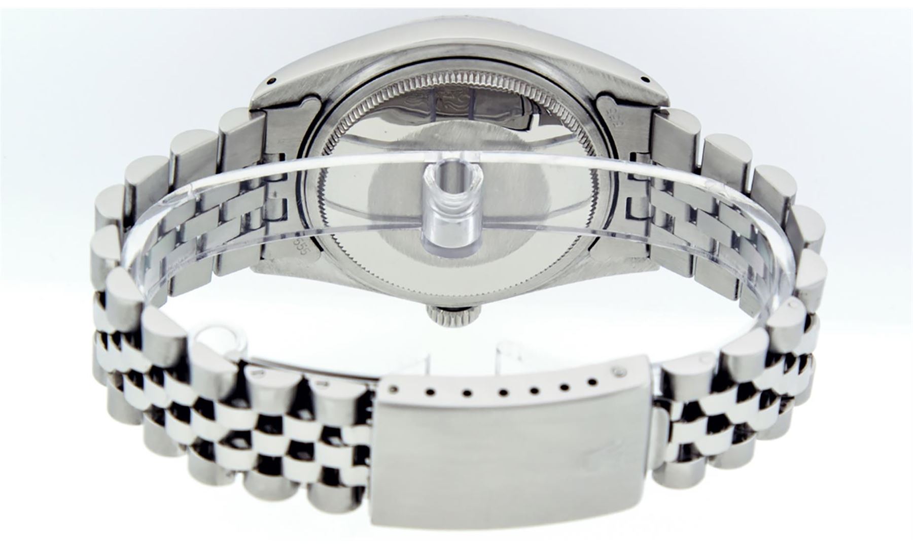 One Pre Owned Stainless Steel Rolex 36MM Datejust Polished, Serviced & Electronically Tested, Rolex Stainless Steel Case: 36mm, Rolex Stainless Steel Crown, Rolex Bezel: White Gold Fluted Bezel. Custom Crystal: New AcrylicWith Magnified Date Window. Custom Hands: New Luminescent Hands. Rolex Movement: Automatic Winding Movement 3035. Custom Dial: Custom Black Dial With Index Hour Markers With Line Track. Date Window: 3 O'Clock Position Date Display, Quickset, Model: Datejust, Condition: G-6 Extra Fine. Rolex Bracelet: Stainless Steel Jubilee Band. Bright Polish & Satin Finish. 7.0 Inch Length, Adjustable. Fold Clasp, With Rolex Logo. Watch Has Been Serviced And Polished It Is Free Of All Scratches And Dents.