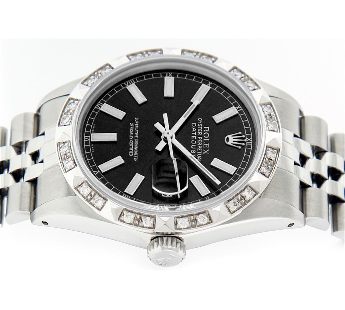 One Mens Rolex Datejust Polished Bright with Satin Finish, Serviced & Electronically Tested, Stainless Steel Case:36mm, Stainless Steel Crown, Custom Bezel:18K White Gold Pyramid Diamond Bezel, Diamond Count: 24 Diamonds Total Weight .70 Carat, Clarity: SI-VS, Color: G to H. Custom Crystal: Synthetic Sapphire Cyclops Lens. Movement: Automatic Winding Movement Caliber 3035. Custom Dial: Black Index Dial With Square Roman Track. Date Window: 3 O'Clock Position Date Display, Quickset, Model: Datejust. Condition: G-6 Extra Fine. Bracelet: Stainless Steel Jubilee. Bright Polish & Satin Finish. 7.0 Inch Length, Adjustable. Standard Clasp, With Rolex Logo. Comes with a 6 month warranty card.