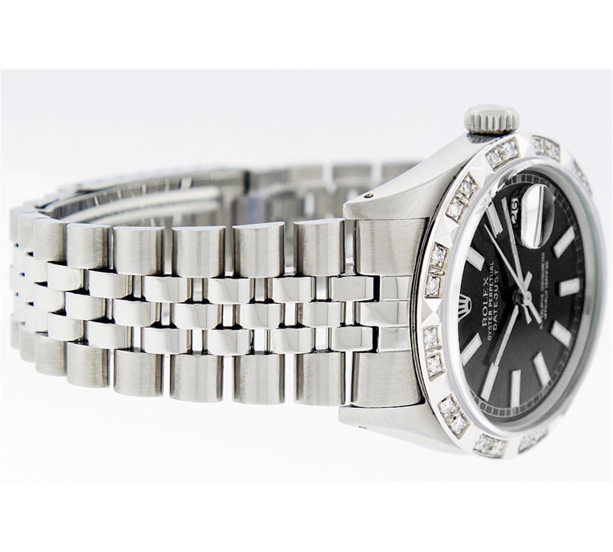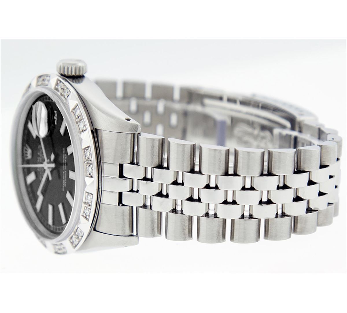 One Mens Rolex Datejust Polished Bright with Satin Finish, Serviced & Electronically Tested, Stainless Steel Case:36mm, Stainless Steel Crown, Custom Bezel:18K White Gold Pyramid Diamond Bezel, Diamond Count: 24 Diamonds Total Weight .70 Carat, Clarity: SI-VS, Color: G to H. Custom Crystal: Synthetic Sapphire Cyclops Lens. Movement: Automatic Winding Movement Caliber 3035. Custom Dial: Black Index Dial With Square Roman Track. Date Window: 3 O'Clock Position Date Display, Quickset, Model: Datejust. Condition: G-6 Extra Fine. Bracelet: Stainless Steel Jubilee. Bright Polish & Satin Finish. 7.0 Inch Length, Adjustable. Standard Clasp, With Rolex Logo. Comes with a 6 month warranty card.