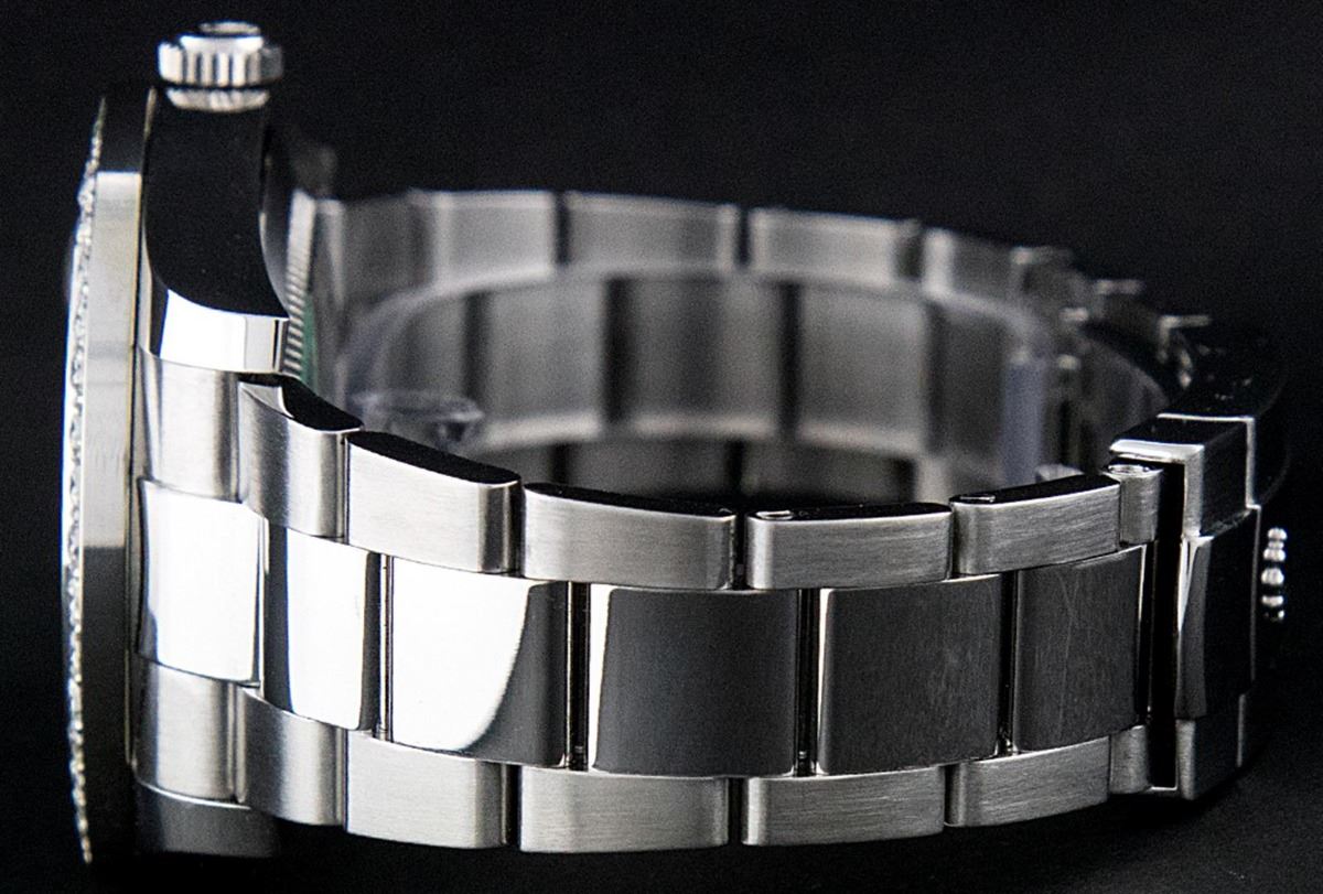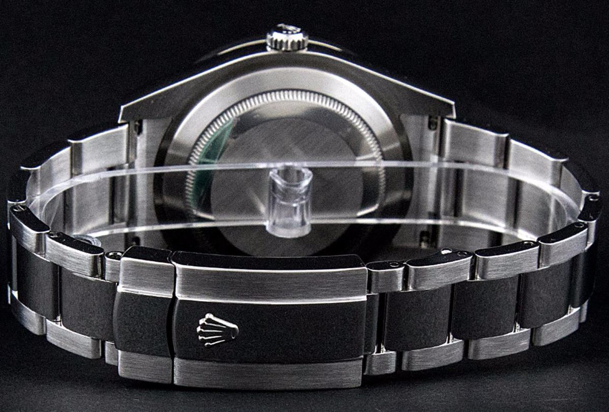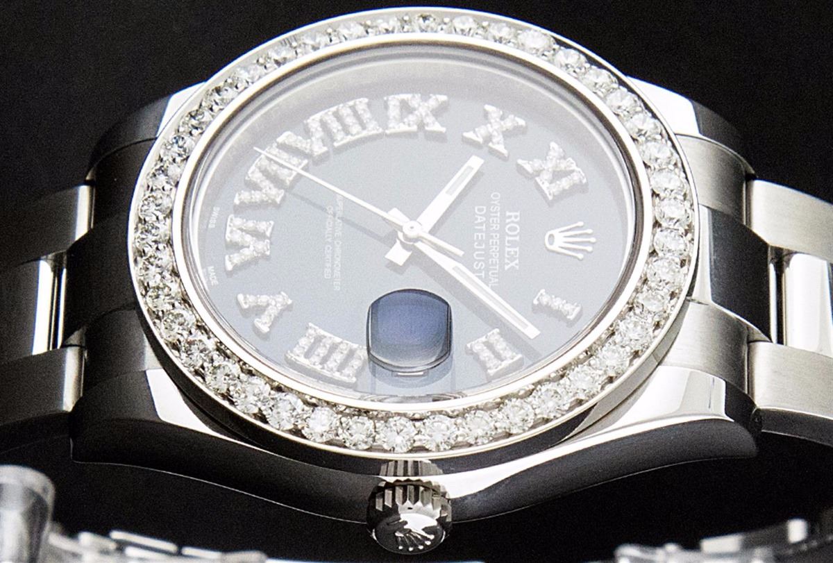 One Mens Rolex Datejust 2 Polished Bright with Satin Finish, Serviced & Electronically Tested, Stainless Steel Case:41mm, Stainless Steel Crown, Custom Bezel: Stainless Steel Beadset Diamond Bezel, Diamond Count: 42 Diamonds. Total Weight 3.5 Carat, Clarity: Si-VS, Color: G to H. Crystal: Synthetic Sapphire Cyclops Lens. Movement: Automatic Winding Movement Caliber 3136. Custom Dial: Black Diamond Roman Dial, Color: G To H, Clarity: SI-VS. Date Window: 3 O'Clock Position Date Display, Quickset, Model: 116300 Datejust 2. Condition: G-6 Extra Fine. Bracelet: Stainless Steel Oyster Band. Bright Polish & Satin Finish. 7.5 Inch Length, Adjustable. Standard Clasp, With Rolex Logo. Comes with a 6 month warranty card.