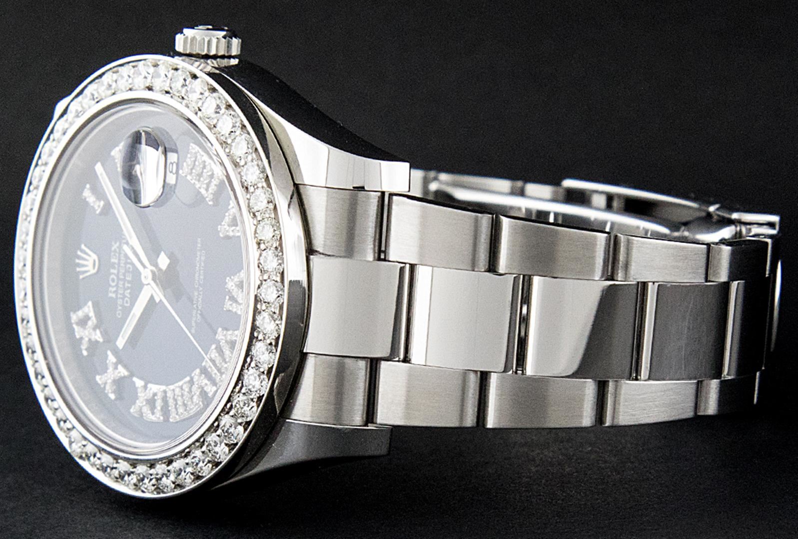 One Mens Rolex Datejust 2 Polished Bright with Satin Finish, Serviced & Electronically Tested, Stainless Steel Case:41mm, Stainless Steel Crown, Custom Bezel: Stainless Steel Beadset Diamond Bezel, Diamond Count: 42 Diamonds. Total Weight 3.5 Carat, Clarity: Si-VS, Color: G to H. Crystal: Synthetic Sapphire Cyclops Lens. Movement: Automatic Winding Movement Caliber 3136. Custom Dial: Black Diamond Roman Dial, Color: G To H, Clarity: SI-VS. Date Window: 3 O'Clock Position Date Display, Quickset, Model: 116300 Datejust 2. Condition: G-6 Extra Fine. Bracelet: Stainless Steel Oyster Band. Bright Polish & Satin Finish. 7.5 Inch Length, Adjustable. Standard Clasp, With Rolex Logo. Comes with a 6 month warranty card.