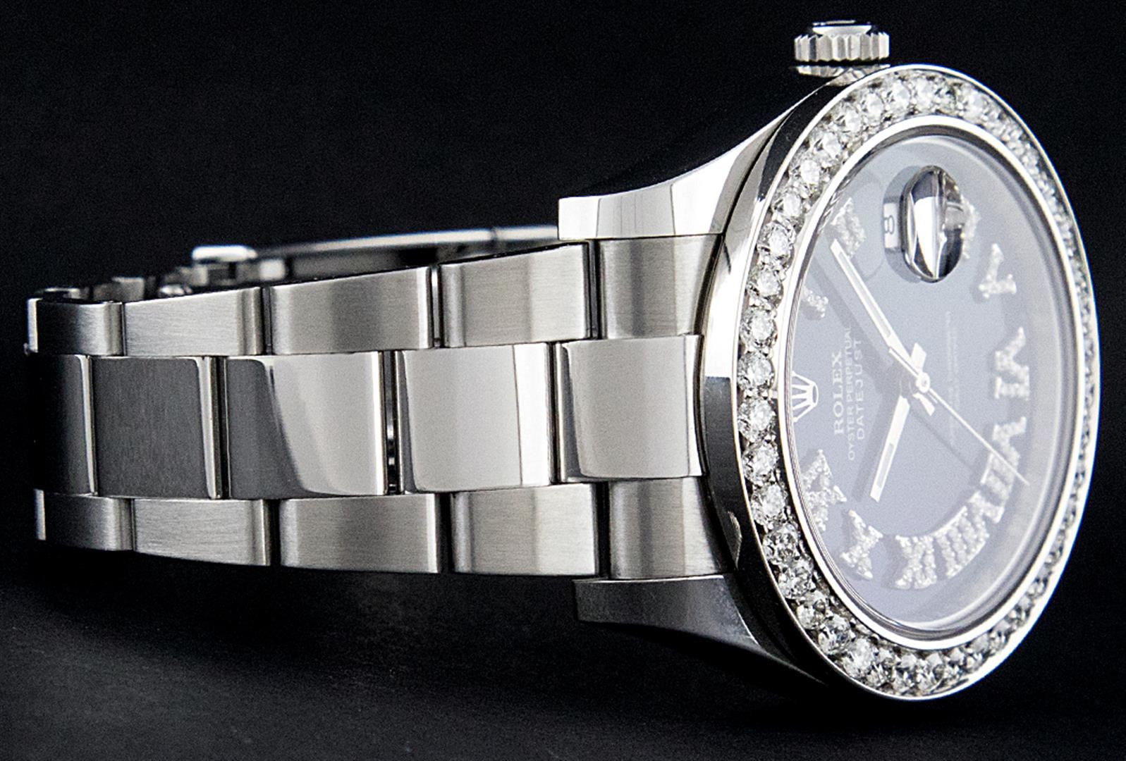 One Mens Rolex Datejust 2 Polished Bright with Satin Finish, Serviced & Electronically Tested, Stainless Steel Case:41mm, Stainless Steel Crown, Custom Bezel: Stainless Steel Beadset Diamond Bezel, Diamond Count: 42 Diamonds. Total Weight 3.5 Carat, Clarity: Si-VS, Color: G to H. Crystal: Synthetic Sapphire Cyclops Lens. Movement: Automatic Winding Movement Caliber 3136. Custom Dial: Black Diamond Roman Dial, Color: G To H, Clarity: SI-VS. Date Window: 3 O'Clock Position Date Display, Quickset, Model: 116300 Datejust 2. Condition: G-6 Extra Fine. Bracelet: Stainless Steel Oyster Band. Bright Polish & Satin Finish. 7.5 Inch Length, Adjustable. Standard Clasp, With Rolex Logo. Comes with a 6 month warranty card.
