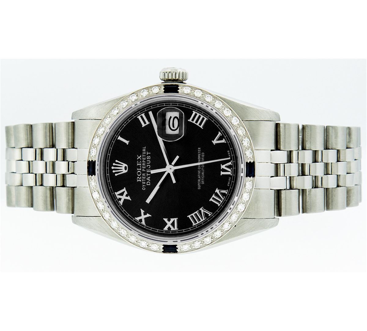 One Mens Rolex Datejust Polished Bright with Satin Finish, Serviced & Electronically Tested, Stainless Steel Case:36mm, Stainless Steel Crown, Custom Bezel: 18K White Gold Sapphire Beadset Diamond Bezel, Diamond + Gem Count: 36 Diamonds + 4 Sapphires. Total Weight 1.00 Carat, Clarity: Si-VS, Color: G to H. Custom Crystal: Synthetic Sapphire Cyclops Lens. Movement: Automatic Winding Movement Caliber 3035. Custom Dial: Black Roman Dial. Date Window: 3 O'Clock Position Date Display, Quickset, Model: Datejust. Condition: G-6 Extra Fine. Bracelet: Stainless Steel Jubilee. Bright Polish & Satin Finish. 7.0 Inch Length, Adjustable. Standard Clasp, With Rolex Logo. Comes with a 6 month warranty card.