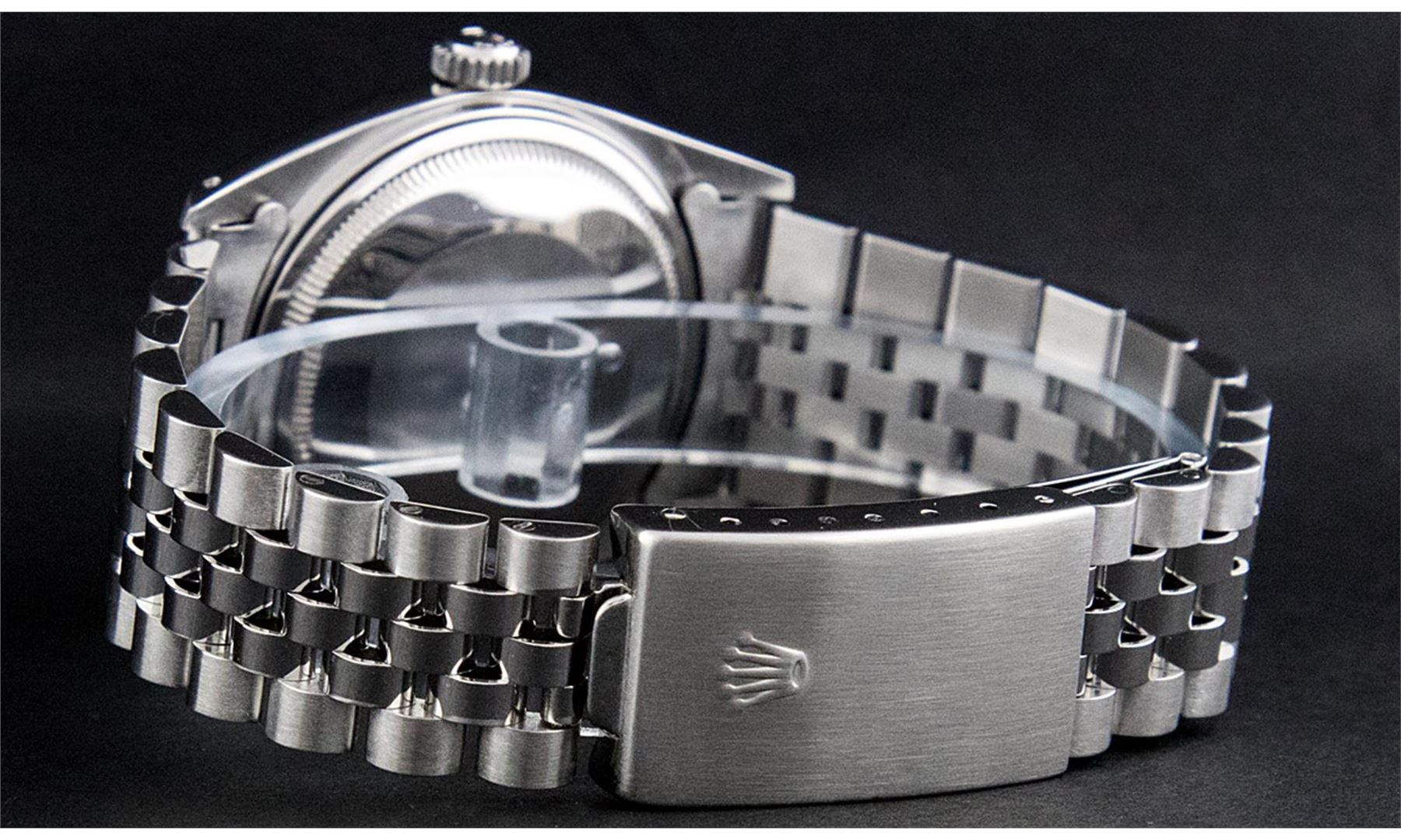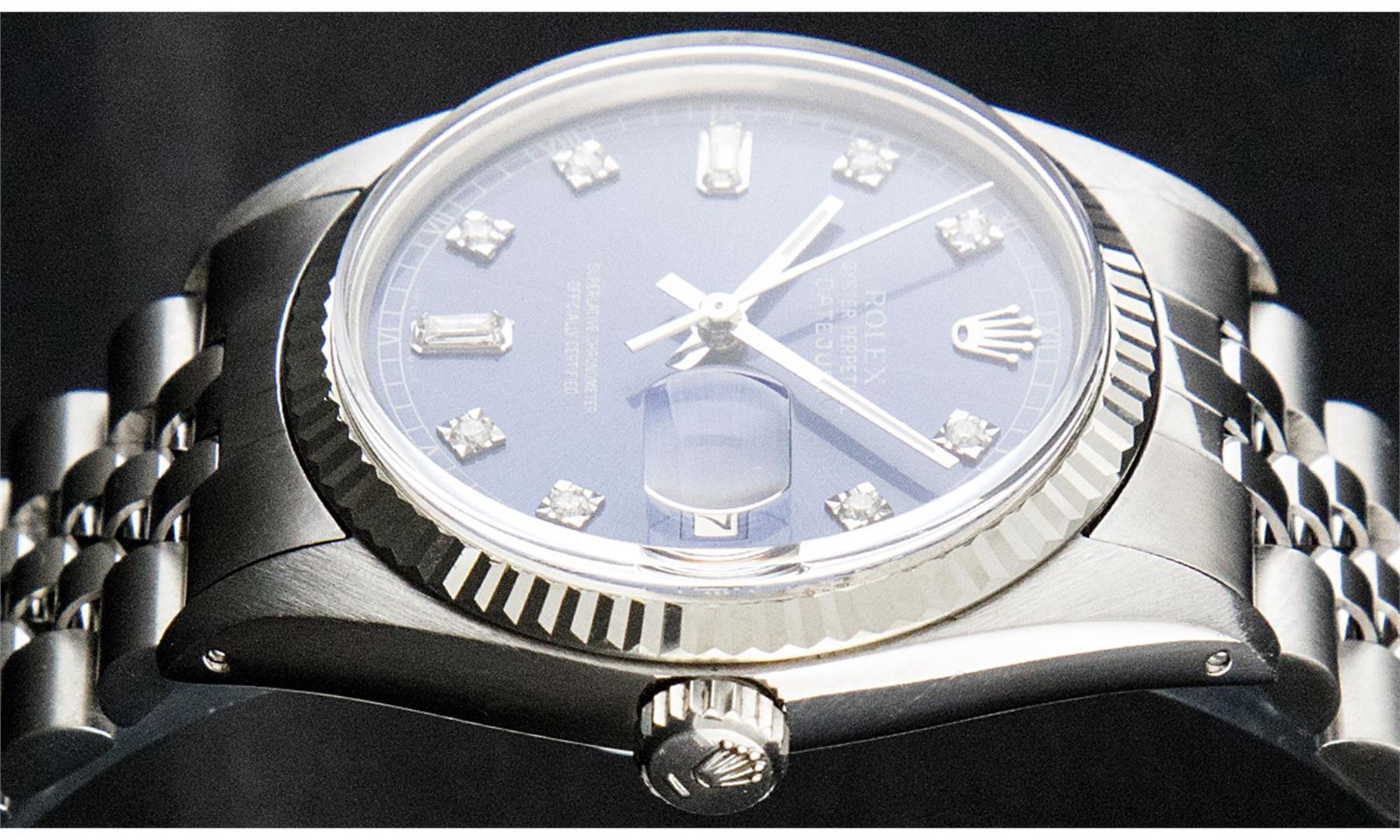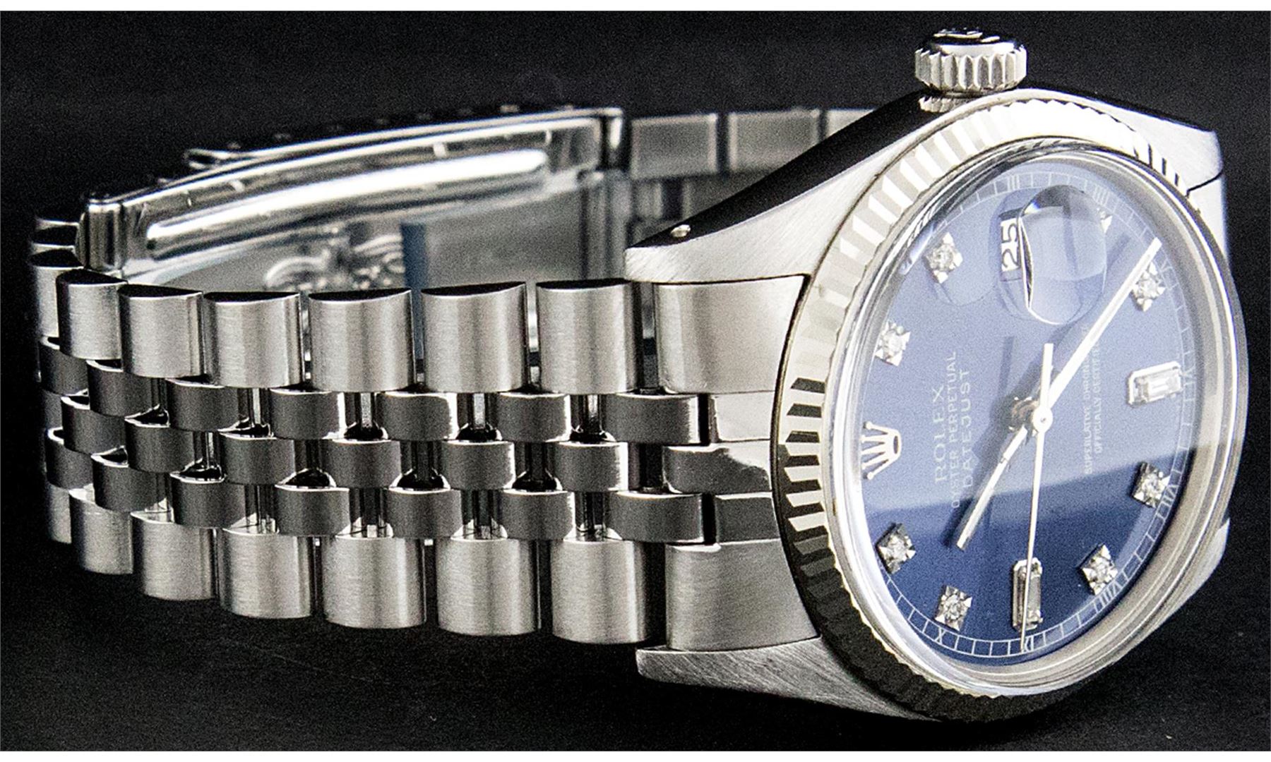 One Gents Rolex Datejust Polished, Serviced & Electronically Tested, Stainless Steel Case:36mm, Stainless Steel Crown, Bezel: 18K White Gold Fluted Bezel. Custom Crystal: Acrylic Cyclops Lens. Movement: Automatic Winding Movement Caliber 3035. Custom Dial: Blue With Diamond Hour Markers Square Setting, Diamond Count: 8 Diamonds + 2 Baguettes, Clarity: SI-VS, Color: G to H. Date Window: 3 O'Clock Position Date Display, Quickset, Model: 16014 Condition: G-6 Extra Fine. Bracelet: Stainless Steel Jubilee. Bright Polish & Satin Finish. 7.0 Inch Length, Adjustable. Standard Clasp, With Rolex Logo. Comes with 6 month warranty.