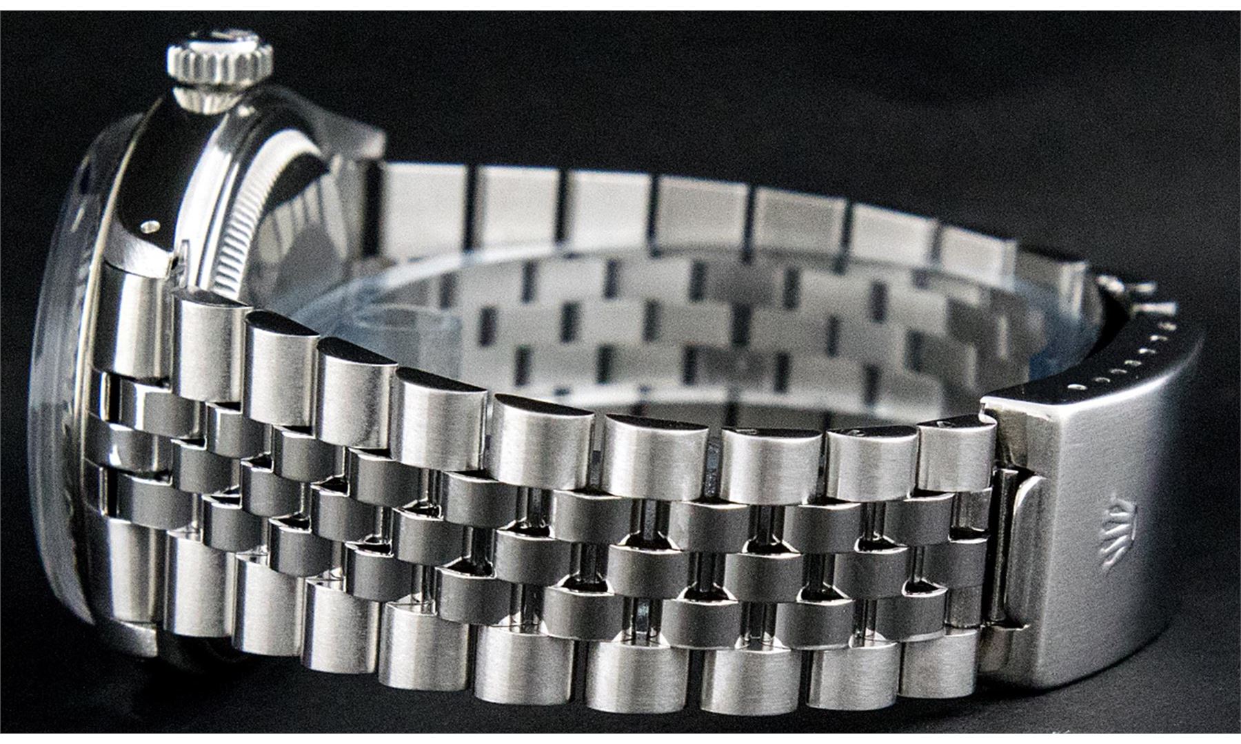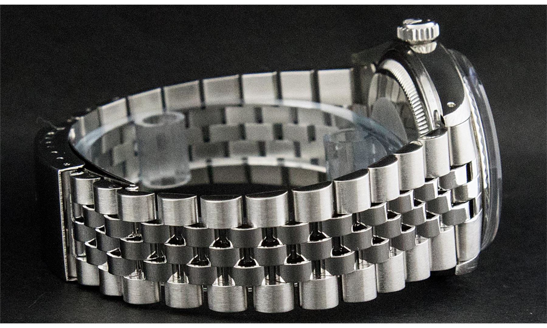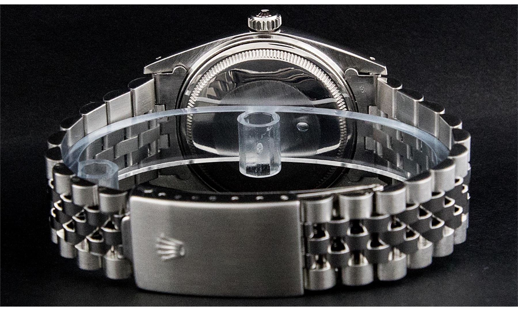 One Gents Rolex Datejust Polished, Serviced & Electronically Tested, Stainless Steel Case:36mm, Stainless Steel Crown, Bezel: 18K White Gold Fluted Bezel. Custom Crystal: Acrylic Cyclops Lens. Movement: Automatic Winding Movement Caliber 3035. Custom Dial: Blue With Diamond Hour Markers Square Setting, Diamond Count: 8 Diamonds + 2 Baguettes, Clarity: SI-VS, Color: G to H. Date Window: 3 O'Clock Position Date Display, Quickset, Model: 16014 Condition: G-6 Extra Fine. Bracelet: Stainless Steel Jubilee. Bright Polish & Satin Finish. 7.0 Inch Length, Adjustable. Standard Clasp, With Rolex Logo. Comes with 6 month warranty.