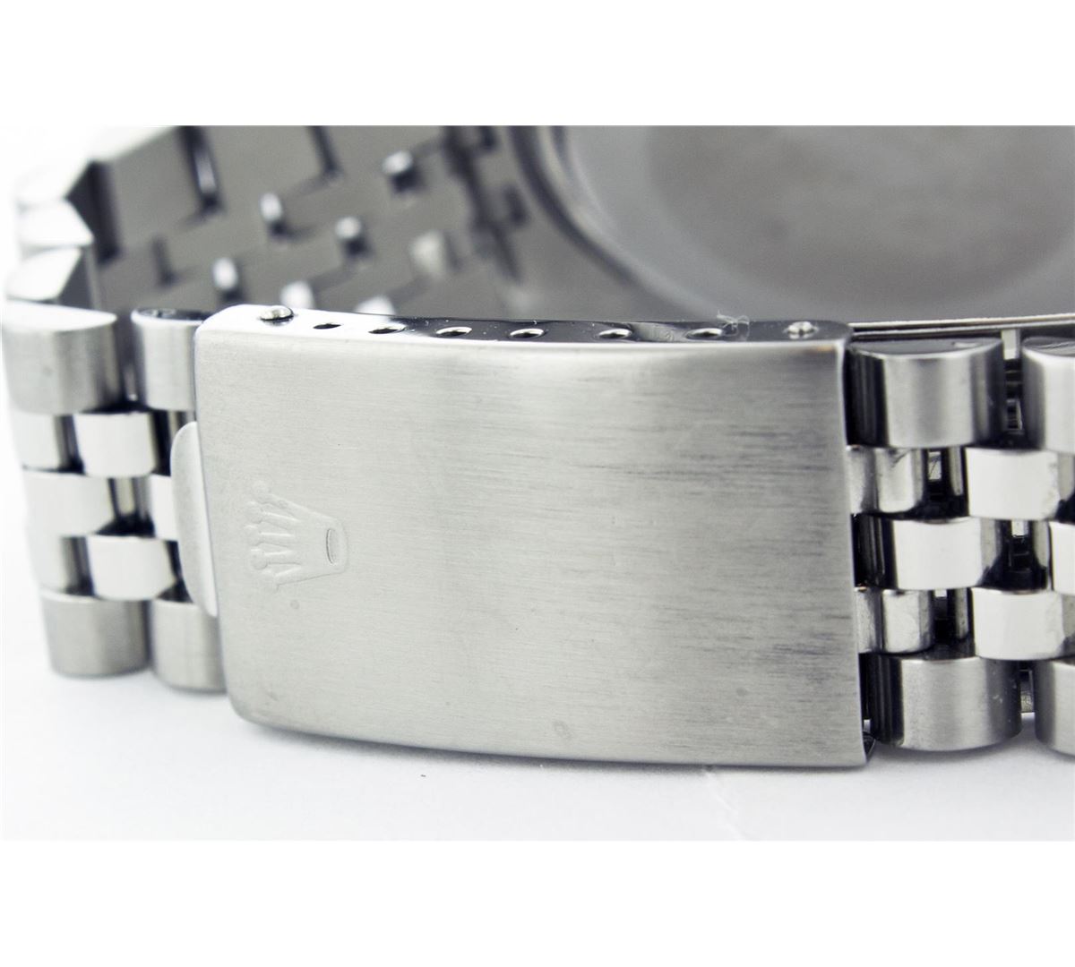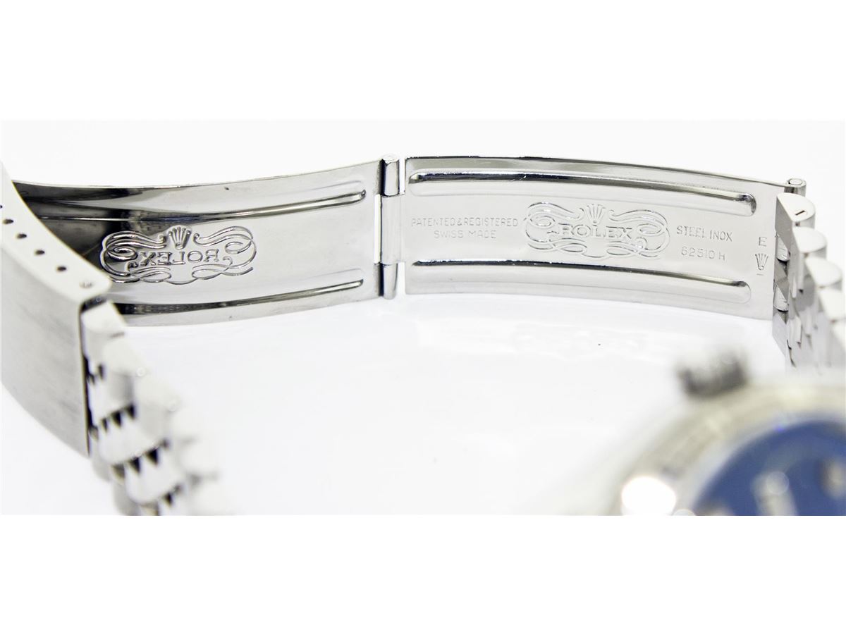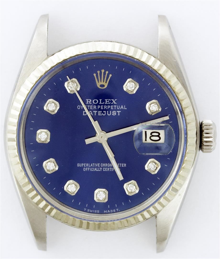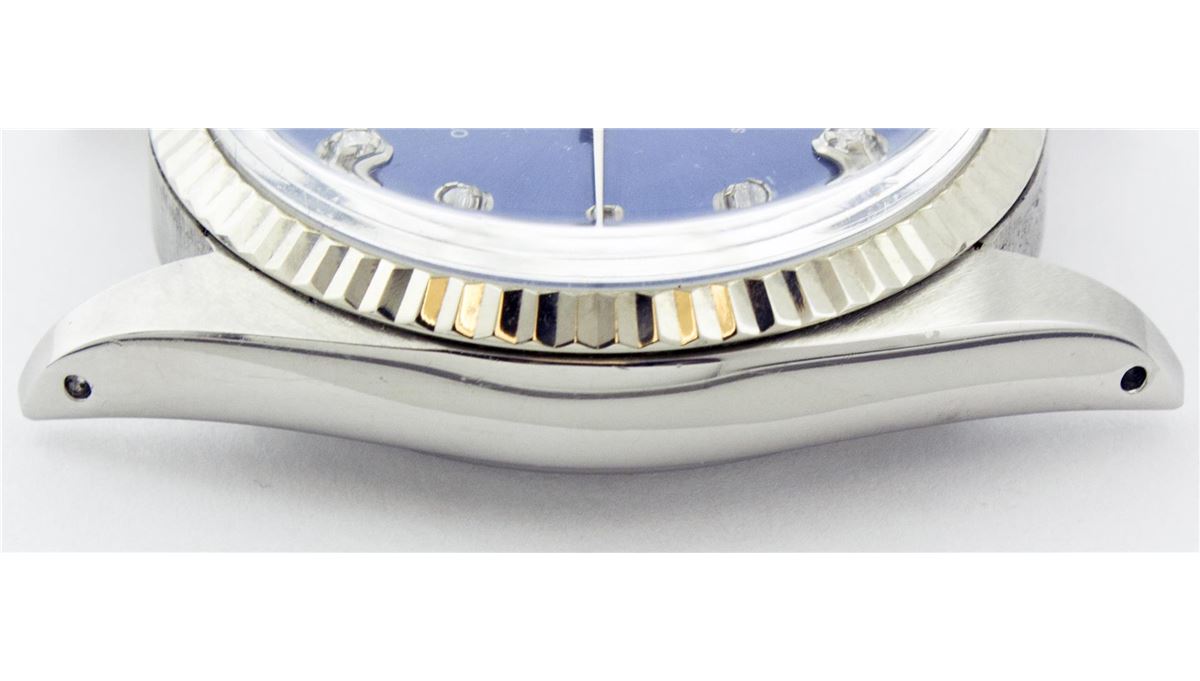 One Gents Rolex Datejust Polished, Serviced & Electronically Tested, Stainless Steel Case:36mm, Stainless Steel Crown, Custom Bezel: 18K White Gold Fluted Bezel. Custom Crystal: Synthetic Sapphire Cyclops Lens. Movement: Automatic Winding Movement Caliber 3035. Custom Dial: Blue Dial With Diamond Hour Markers, Diamond Count: 10 Diamonds In Dial, Clarity: SI-VS, Color: G to H. Date Window: 3 O'Clock Position Date Display, Quickset, Model: 16014 Condition: G-6 Extra Fine. Bracelet: Stainless Steel Jubilee. Bright Polish & Satin Finish. 6.5 Inch Length, Adjustable. Standard Clasp, With Rolex Logo.