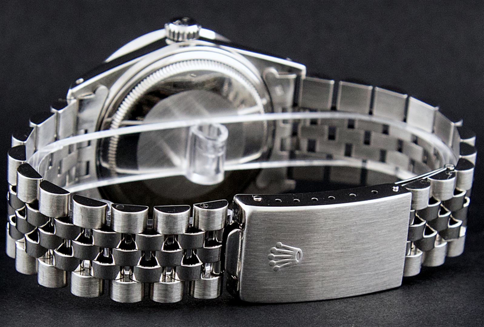 One Mens Rolex Datejust Polished Bright with Satin Finish, Serviced & Electronically Tested, Stainless Steel Case:36mm, Stainless Steel Crown, Custom Bezel: 18K White Gold Pyramid Diamond Bezel, Diamond Count: 24 Diamonds Total Weight .70 Carat, Clarity: SI-VS, Color: G to H. Custom Crystal: Synthetic Sapphire Cyclops Lens. Movement: Automatic Winding Movement Caliber 3035. Custom Dial: Blue Index Dial. Date Window: 3 O'Clock Position Date Display, Quickset, Model: 16014 Condition: G-6 Extra Fine. Bracelet: Stainless Steel Jubilee. Bright Polish & Satin Finish. 7.0 Inch Length, Adjustable. Standard Clasp, With Rolex Logo.