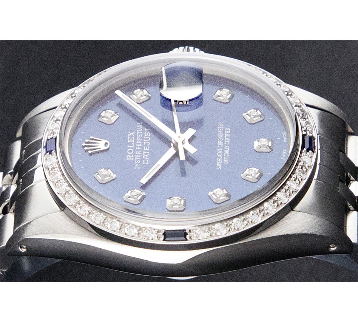 One Gents Rolex Datejust Polished, Serviced & Electronically Tested, Stainless Steel Case:36mm, Stainless Steel Crown, Custom Bezel: 18K White Gold Sapphire Beadset Diamond Bezel, Diamond + Gem Count: 36 Diamonds + 4 Sapphires Total Weight 1.00 Carat, Clarity: SI-VS, Color: G to H. Custom Crystal: Synthetic Sapphire Cyclops Lens. Movement: Automatic Winding Movement Caliber 3035. Custom Dial: Blue Diamond Dial With Small Track, Diamond Count: 10 Diamond Dial G To H In Color, Clarity: SI-VS. Date Window: 3 O'Clock Position Date Display, Quickset, Model: 16014 Condition: G-6 Extra Fine. Bracelet: Stainless Steel Jubilee. Bright Polish & Satin Finish. 7.0 Inch Length, Adjustable. Standard Clasp, With Rolex Logo.