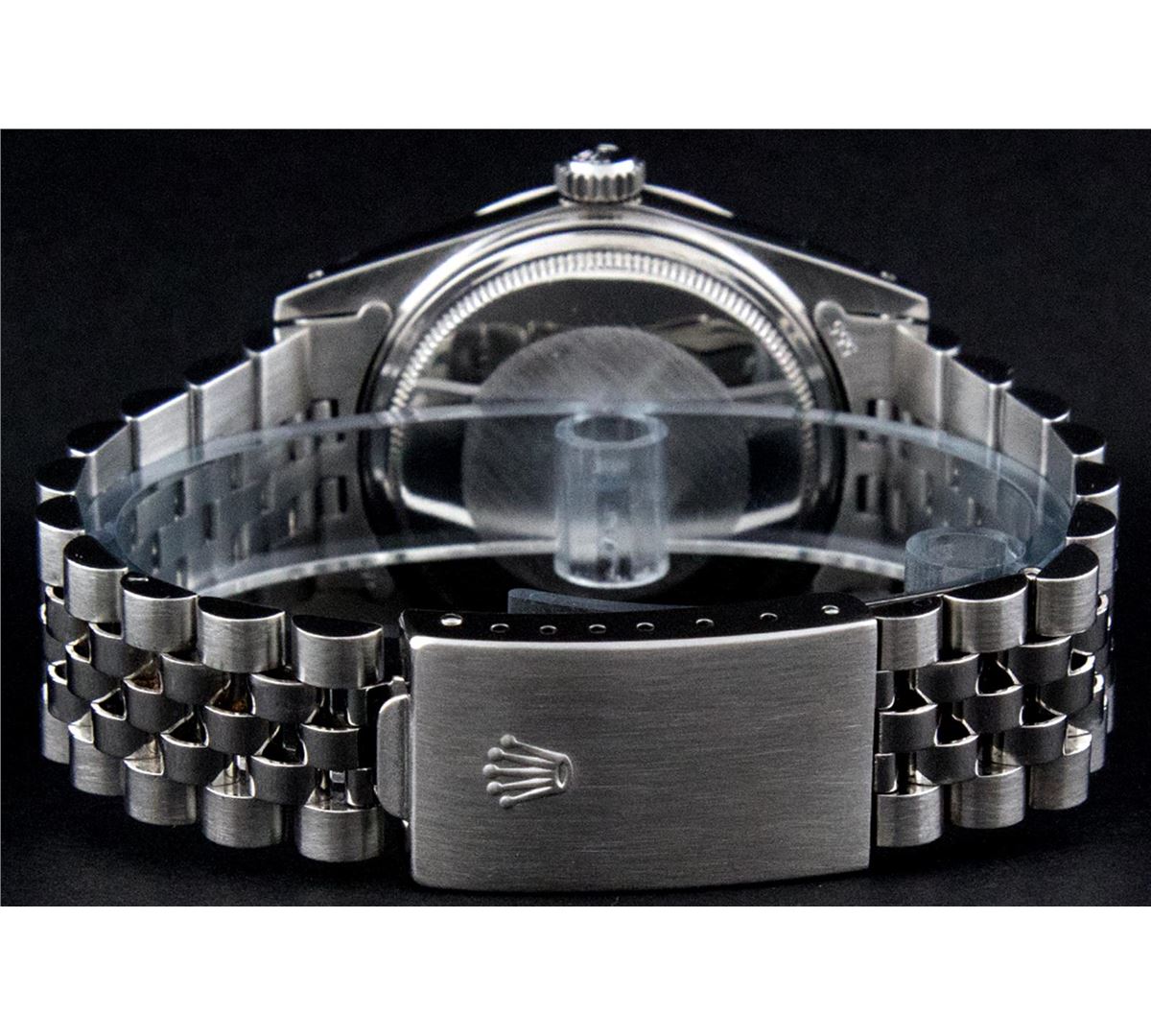One Gents Rolex Datejust Polished, Serviced & Electronically Tested, Stainless Steel Case:36mm, Stainless Steel Crown, Custom Bezel: 18K White Gold Sapphire Beadset Diamond Bezel, Diamond + Gem Count: 36 Diamonds + 4 Sapphires Total Weight 1.00 Carat, Clarity: SI-VS, Color: G to H. Custom Crystal: Synthetic Sapphire Cyclops Lens. Movement: Automatic Winding Movement Caliber 3035. Custom Dial: Blue Diamond Dial With Small Track, Diamond Count: 10 Diamond Dial G To H In Color, Clarity: SI-VS. Date Window: 3 O'Clock Position Date Display, Quickset, Model: 16014 Condition: G-6 Extra Fine. Bracelet: Stainless Steel Jubilee. Bright Polish & Satin Finish. 7.0 Inch Length, Adjustable. Standard Clasp, With Rolex Logo.