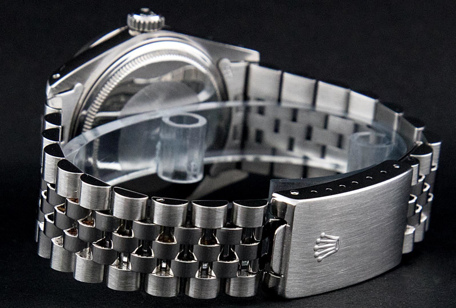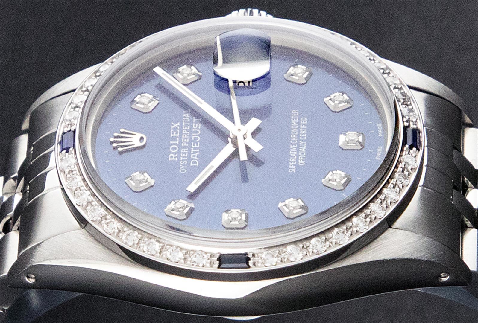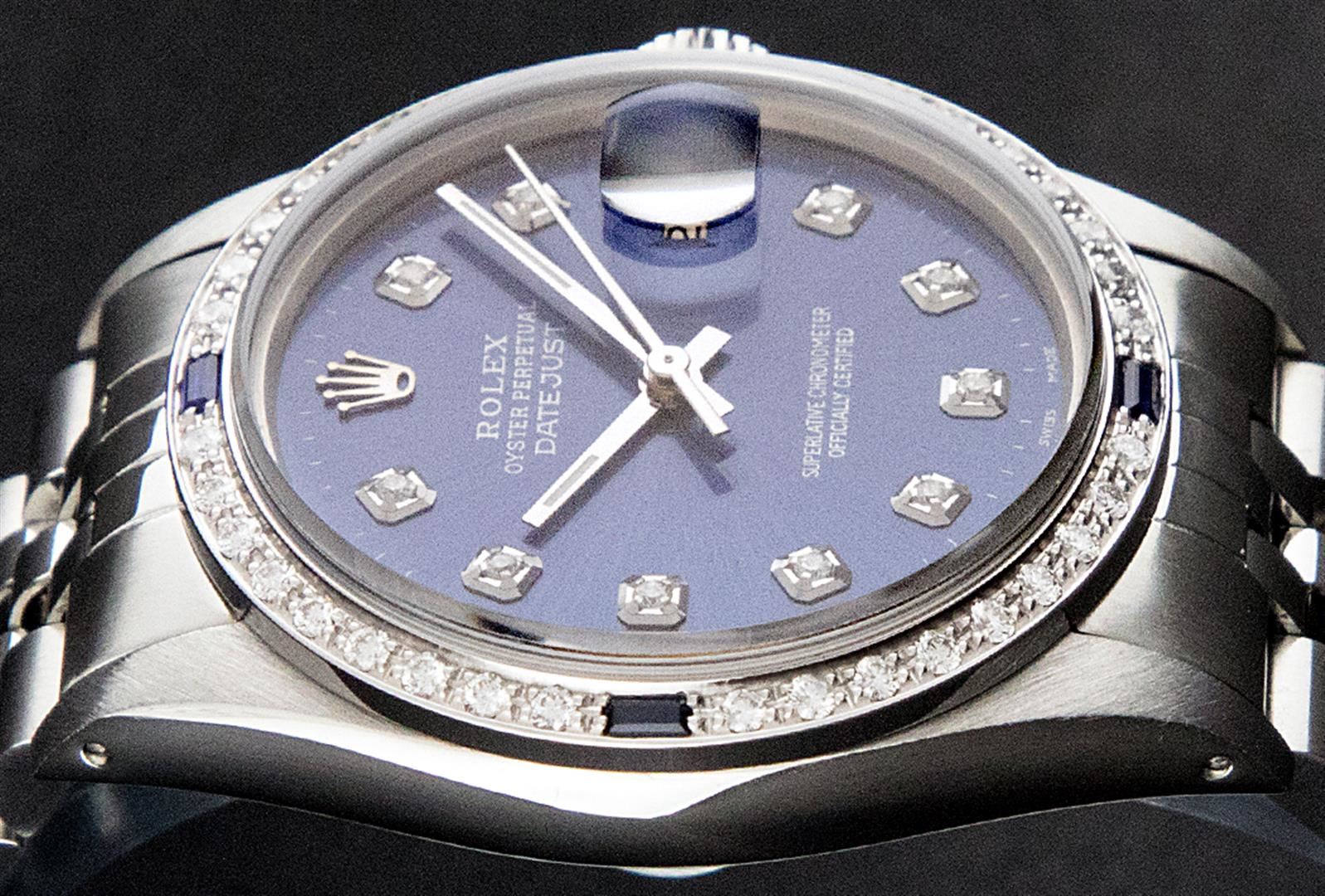 One Gents Rolex Datejust Polished, Serviced & Electronically Tested, Stainless Steel Case:36mm, Stainless Steel Crown, Custom Bezel: 18K White Gold Sapphire Beadset Diamond Bezel, Diamond + Gem Count: 36 Diamonds + 4 Sapphires Total Weight 1.00 Carat, Clarity: SI-VS, Color: G to H. Custom Crystal: Synthetic Sapphire Cyclops Lens. Movement: Automatic Winding Movement Caliber 3035. Custom Dial: Blue Diamond Dial With Small Track, Diamond Count: 10 Diamond Dial G To H In Color, Clarity: SI-VS. Date Window: 3 O'Clock Position Date Display, Quickset, Model: 16014 Condition: G-6 Extra Fine. Bracelet: Stainless Steel Jubilee. Bright Polish & Satin Finish. 7.0 Inch Length, Adjustable. Standard Clasp, With Rolex Logo.