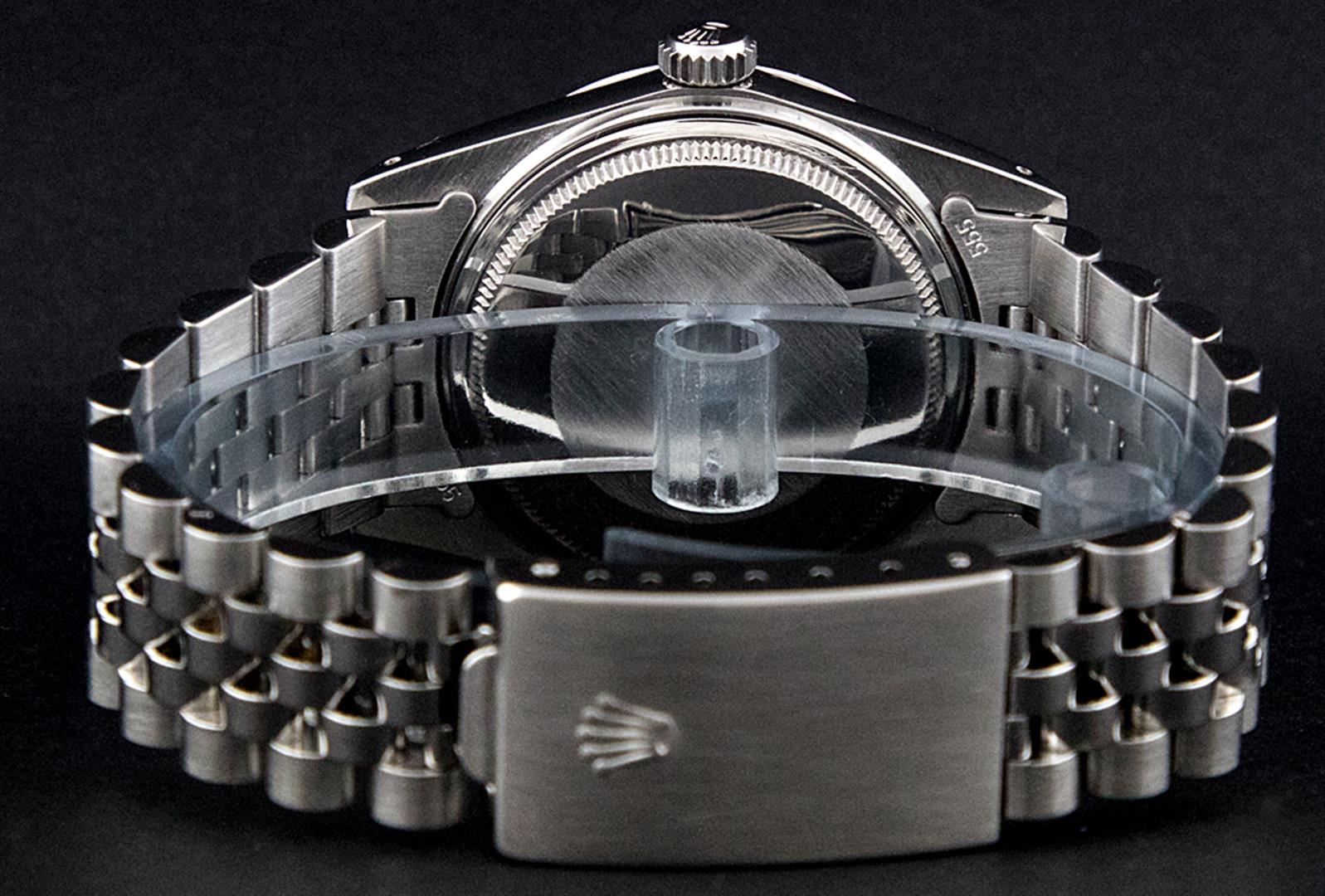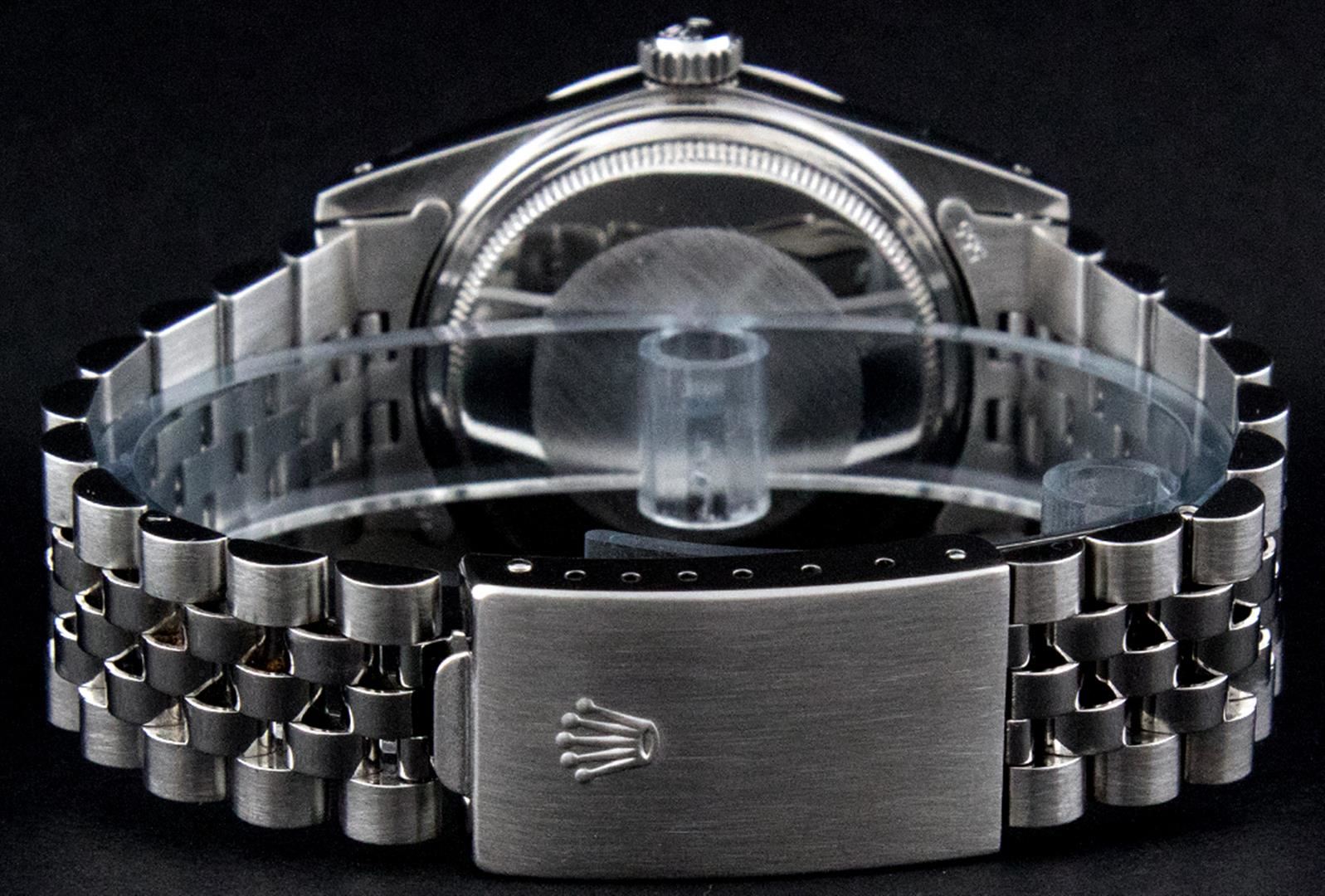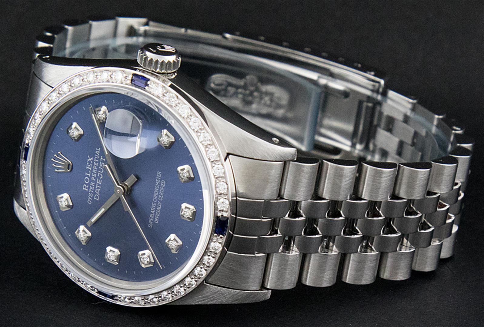 One Gents Rolex Datejust Polished, Serviced & Electronically Tested, Stainless Steel Case:36mm, Stainless Steel Crown, Custom Bezel: 18K White Gold Sapphire Beadset Diamond Bezel, Diamond + Gem Count: 36 Diamonds + 4 Sapphires Total Weight 1.00 Carat, Clarity: SI-VS, Color: G to H. Custom Crystal: Synthetic Sapphire Cyclops Lens. Movement: Automatic Winding Movement Caliber 3035. Custom Dial: Blue Diamond Dial With Small Track, Diamond Count: 10 Diamond Dial G To H In Color, Clarity: SI-VS. Date Window: 3 O'Clock Position Date Display, Quickset, Model: 16014 Condition: G-6 Extra Fine. Bracelet: Stainless Steel Jubilee. Bright Polish & Satin Finish. 7.0 Inch Length, Adjustable. Standard Clasp, With Rolex Logo.