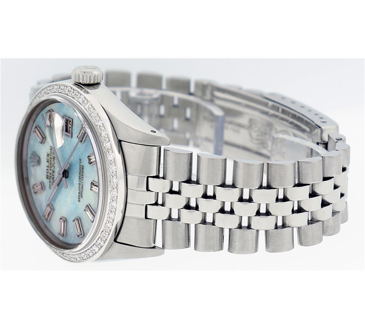 One Gents Rolex Datejust Polished, Serviced & Electronically Tested, Stainless Steel Case:36mm, Stainless Steel Crown, Custom Bezel: 18K White Gold Beadset Diamond Bezel, Diamond Count: 44 Diamonds, Total Weight 1.00 Carat, Clarity: SI-VS, Color: G to H. Custom Crystal: Synthetic Sapphire Cyclops Lens. Movement: Automatic Winding Movement Caliber 3035. Custom Dial: Blue MOP Baguette Diamond Hour Markers, Diamond Count: 10 Diamond Baguette. G To H In Color, Clarity: SI-VS. Date Window: 3 O'Clock Position Date Display, Quickset, Model: Datejust. Condition: G-6 Extra Fine. Bracelet: Stainless Steel Jubilee. Bright Polish & Satin Finish. 7.0 Inch Length, Adjustable. Standard Clasp, With Rolex Logo. Comes with 6 month warranty.