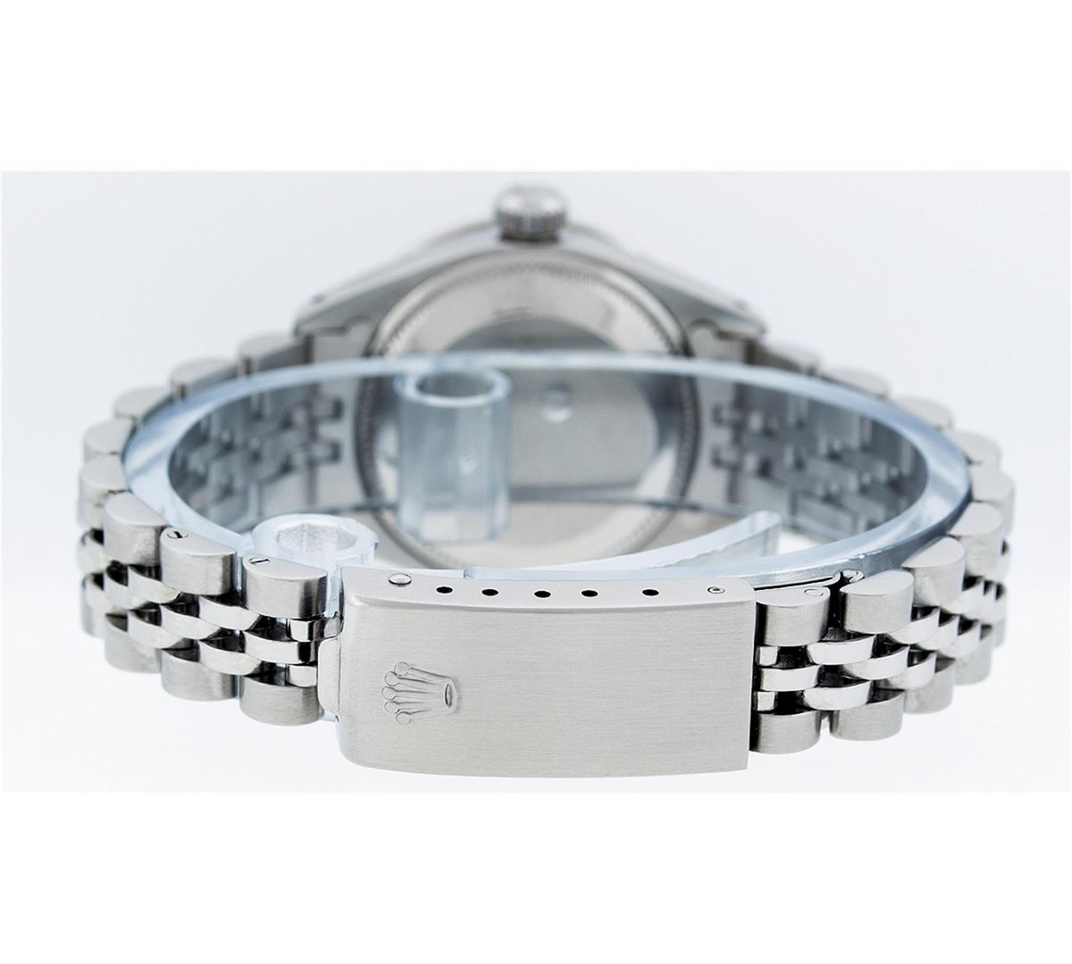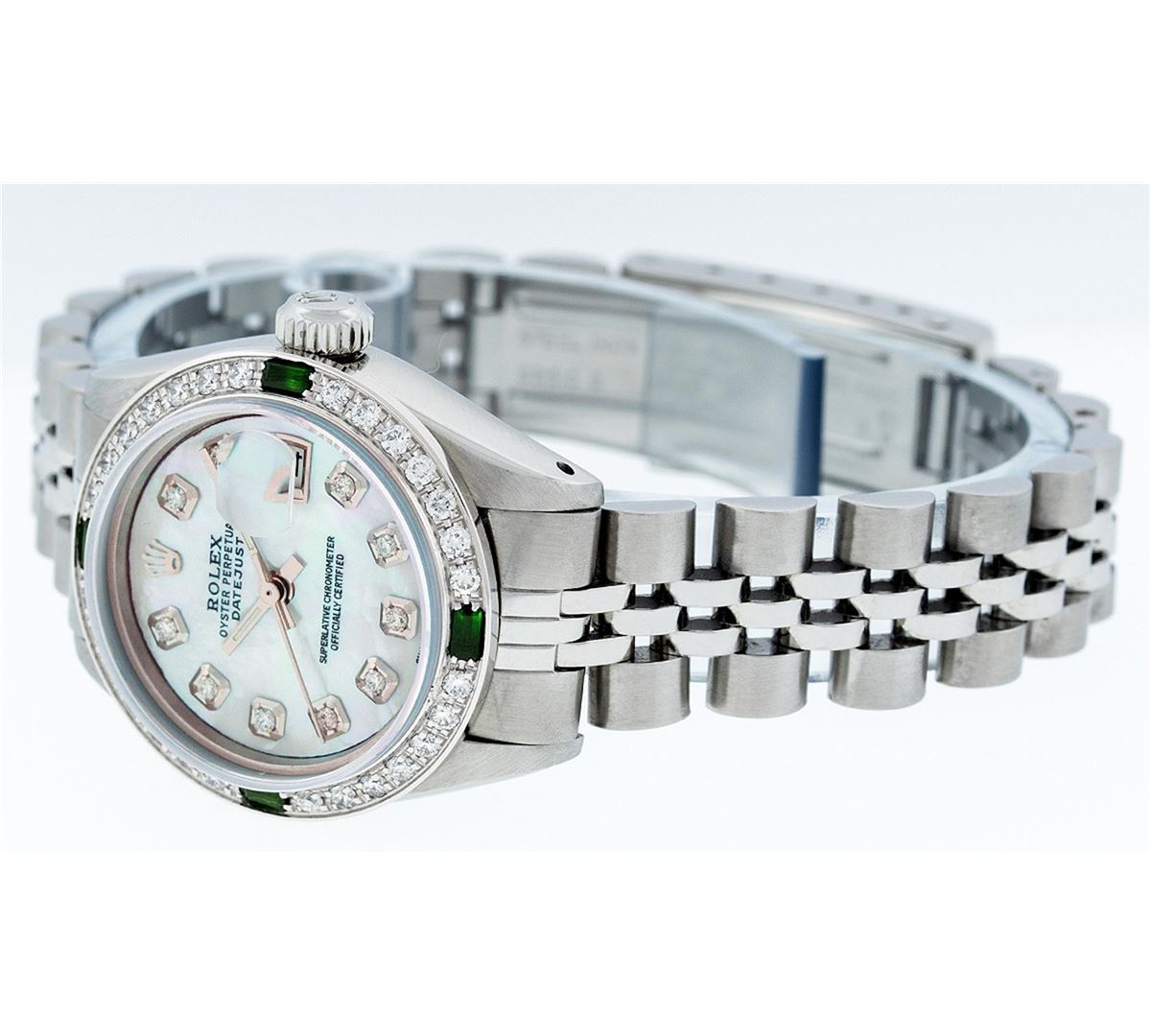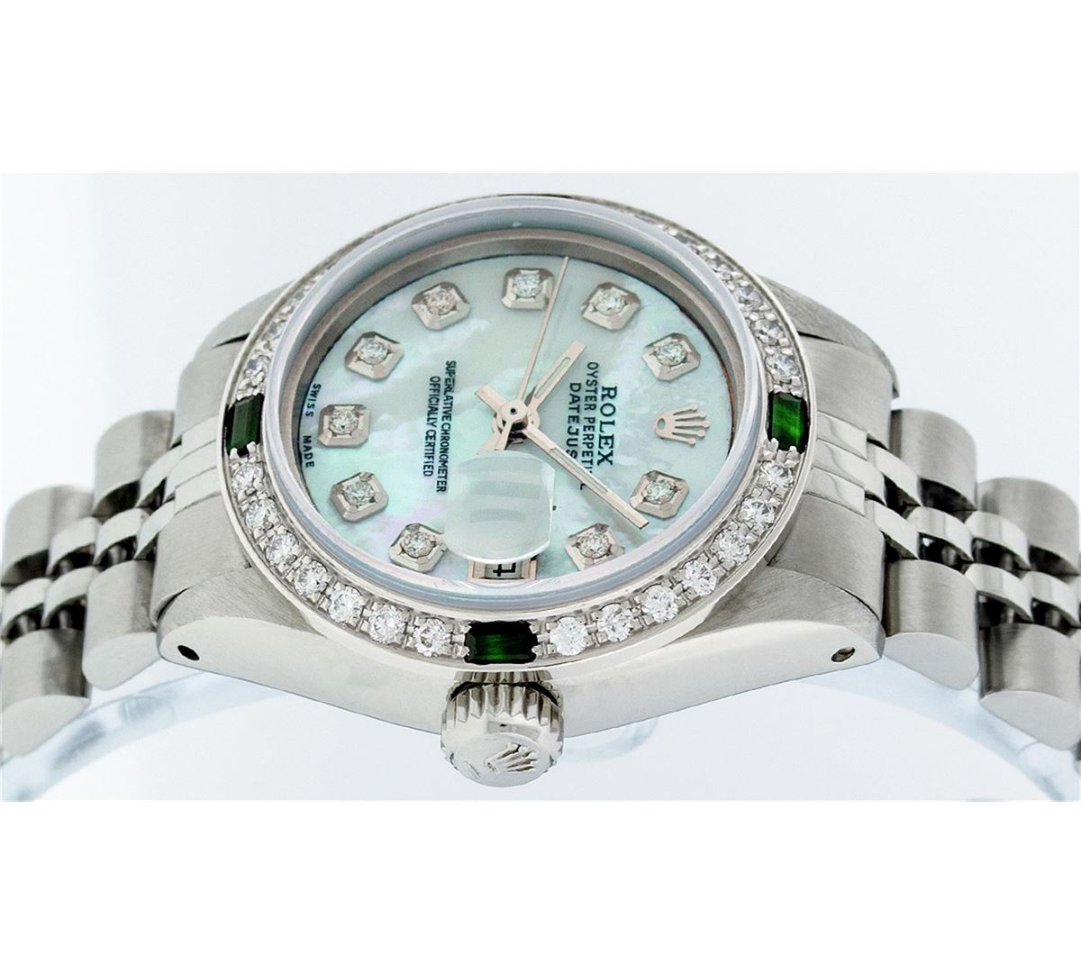 Ladies Rolex Datejust Polished Bright with Satin Finish, Serviced & Electronically Tested, Stainless Steel Case:26mm, Stainless Steel Crown, Custom Bezel: 18K White Gold Emerald Beadset Diamond Bezel, Diamond + Gem Count: 28 Diamonds + 4 Emeralds. Total Weight .70 Carat, Clarity: SI-VS, Color: G to H. Custom Crystal: Synthetic Sapphire Cyclops Lens. Movement: Automatic Winding Movement Caliber 2030. Custom Dial: Refinished Blue MOP With Diamond Hour Markers. Diamond Count: 10 Diamonds, Color: G To H, Clarity: SI-VS. Date Window: 3 O'Clock Position Date Display, Model: Datejust. Condition: G-6 Extra Fine. Bracelet: Stainless Steel Jubilee. Bright Polish & Satin Finish. 6.0 Inch Length, Adjustable. Standard Clasp, With Rolex Logo. Comes with 6 month warranty.