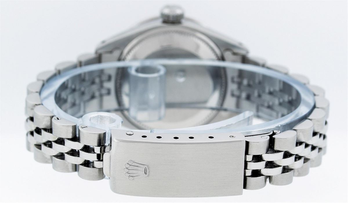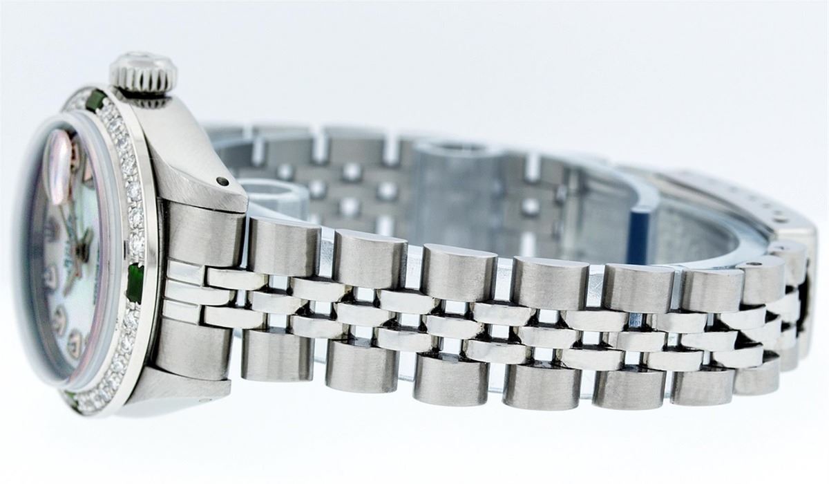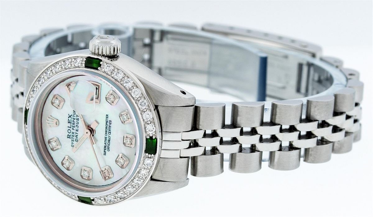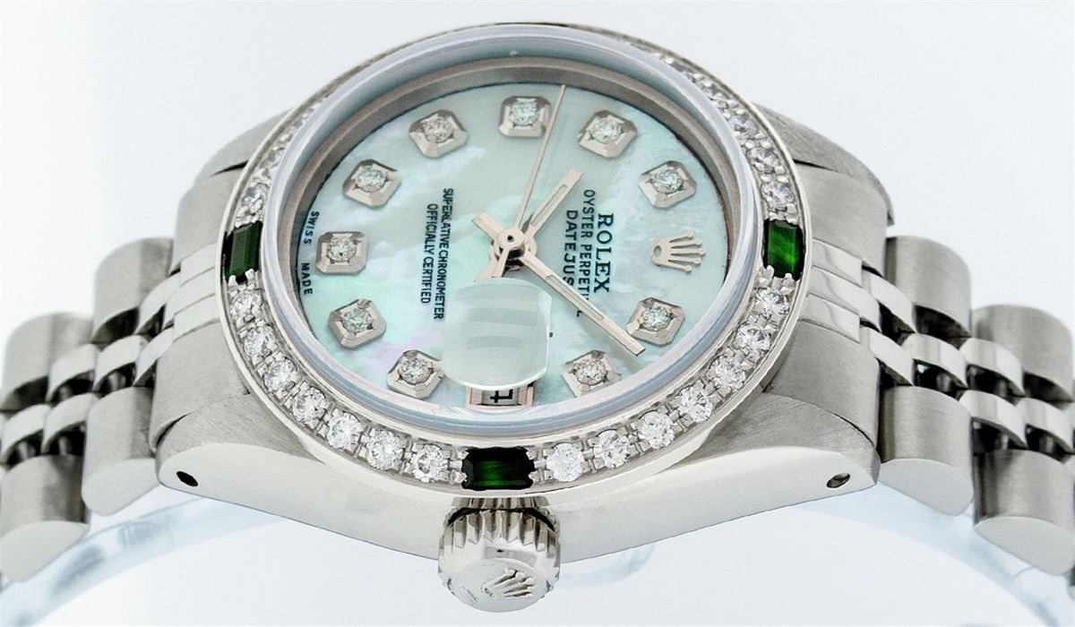 Ladies Rolex Datejust Polished Bright with Satin Finish, Serviced & Electronically Tested, Stainless Steel Case:26mm, Stainless Steel Crown, Custom Bezel: 18K White Gold Emerald Beadset Diamond Bezel, Diamond + Gem Count: 28 Diamonds + 4 Emeralds. Total Weight .70 Carat, Clarity: SI-VS, Color: G to H. Custom Crystal: Synthetic Sapphire Cyclops Lens. Movement: Automatic Winding Movement Caliber 2030. Custom Dial: Refinished Blue MOP With Diamond Hour Markers. Diamond Count: 10 Diamonds, Color: G To H, Clarity: SI-VS. Date Window: 3 O'Clock Position Date Display, Model: Datejust. Condition: G-6 Extra Fine. Bracelet: Stainless Steel Jubilee. Bright Polish & Satin Finish. 6.0 Inch Length, Adjustable. Standard Clasp, With Rolex Logo. Comes with 6 month warranty.