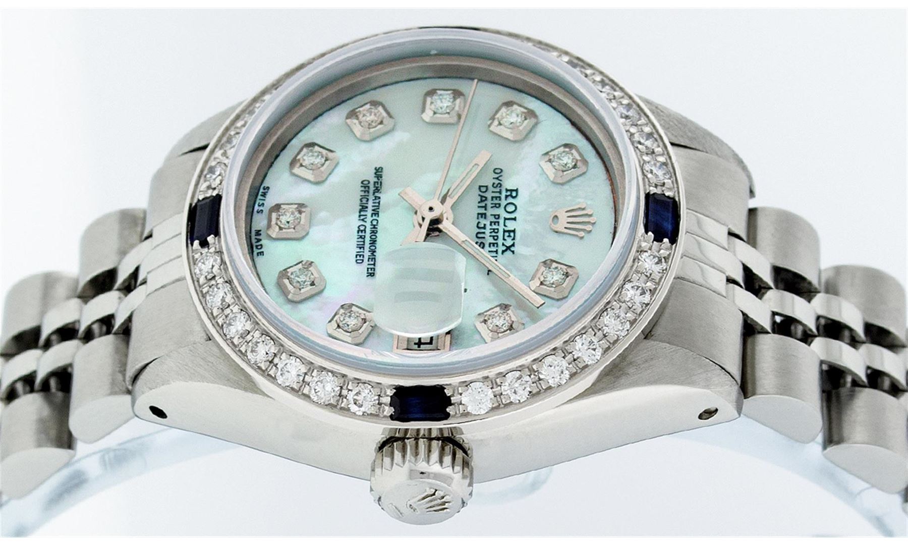 One Ladies Rolex Datejust Polished Bright with Satin Finish, Serviced & Electronically Tested, Stainless Steel Case:26mm, Stainless Steel Crown, Custom Bezel: 18K White Gold Sapphire Beadset Diamond Bezel, Diamond Count: 28 Diamonds + 4 Sapphires Total Weight .70 Carat, Clarity: SI-VS, Color: G to H. Custom Crystal: Synthetic Sapphire Cyclops Lens. Movement: Automatic Winding Movement Caliber 2030. Custom Dial: Blue Mother Of Pearl Diamond, Diamond Count: 10 Diamonds In Dial, Clarity: SI-VS, Color: G to H. Date Window: 3 O'Clock Position Date Display, Model: Datejust. Condition: G-6 Extra Fine. Bracelet: Stainless Steel Jubilee Band. Bright Polish & Satin Finish. 6.0 Inch Length, Adjustable. Standard Clasp, With Rolex Logo. Comes with 6 month warranty.