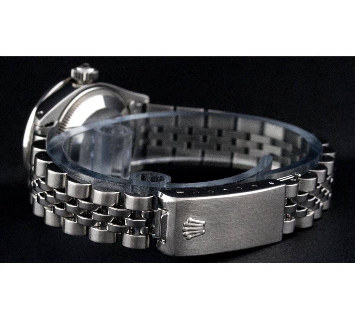One Ladies Rolex Datejust Polished Bright with Satin Finish, Serviced & Electronically Tested, Stainless Steel Case:26mm, Stainless Steel Crown, Custom Bezel: 18K White Gold Sapphire Beadset Diamond Bezel, Diamond + Gem Count: 28 Diamonds + 4 Sapphires Total Weight .70 Carat, Clarity: SI-VS, Color: G to H. Custom Crystal: Synthetic Sapphire Cyclops Lens. Movement: Automatic Winding Movement Caliber 2030. Custom Dial: Refinished Blue Roman Dial With Square Track. Date Window: 3 O'Clock Position Date Display, Model: Datejust. Condition: G-6 Extra Fine. Bracelet: Stainless Steel Jubilee. Bright Polish & Satin Finish. 5.5 Inch Length, Adjustable. Standard Clasp, With Rolex Logo. Comes with a 6 month warranty card.