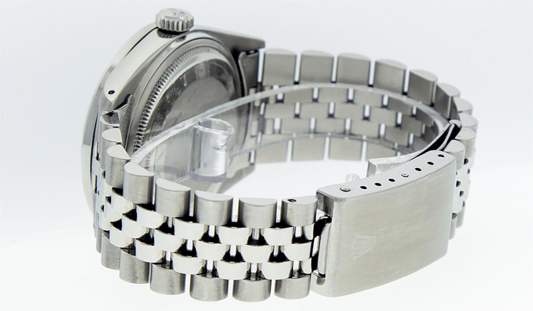 One Rolex Stainless Steel Datejust Polished Bright with Satin Finish, This Watch Has Been Serviced & Electronically Tested, Stainless Steel Case: 36mm, Stainless Steel Crown, Custom Bezel: New Stainless Steel Beadset Diamond Bezel, Diamond Count: 54 Diamonds, Total Weight 1.00 Carat, Clarity: SI-VS, Color: G to H. Custom Crystal: New Synthetic Sapphire Cyclops Lens. Custom Hands: New Luminescent Hands. Movement: Automatic Winding Movement. Custom Dial: Blue String Diamond Dial, Diamond Count: 58 Diamonds In Dial, Color: G to H, Clarity: VS2-SI1. Date Window: 3 O'Clock Position Date Display, Quickset, Model: Datejust. Condition: G-6 Extra Fine. Bracelet: Stainless Steel Jubilee Band. Bright Polish & Satin Finish. 7.0 Inch Length, Adjustable. Standard Clasp, With Rolex Logo. This Watch Has Been Serviced Time Tested And Is In Excellent Condition It Is Free Of All Scratches And Dents.