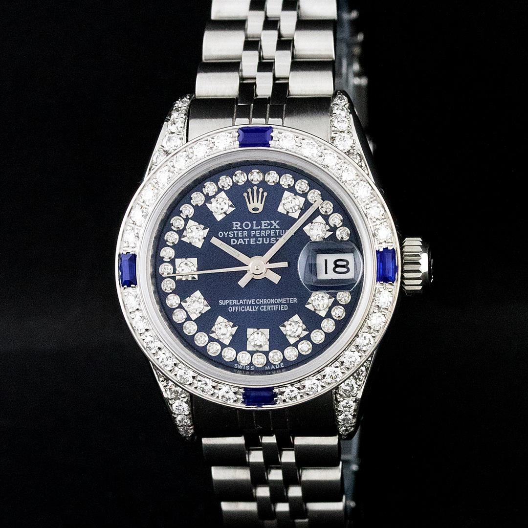 One Ladies Rolex Datejust Polished Bright with Satin Finish, Serviced & Electronically Tested, Stainless Steel Case:26mm, Stainless Steel Crown, Diamond Lugs: 16 Diamonds On Lugs, Clarity: SI-VS, Color: G to H. Custom Bezel: 18K White Gold Sapphire Bezel, Diamond Count: 28 Diamonds + 4 Sapphires, Total Weight 1.00 Carat, Clarity: SI-VS, Color: G to H. Custom Crystal: Synthetic Sapphire Cyclops Lens. Movement: Automatic Winding Movement Caliber 2030. Custom Dial: Refinished Blue With String Diamond Dial, 43 Diamonds in Dial G To H In Color, Clarity: VVS. Date Window: 3 O'Clock Position Date Display, Non Quickset, Model: 6917 Condition: G-6 Extra Fine. Bracelet: Stainless Steel Jubilee. Bright Polish & Satin Finish. 5.5 Inch Length, Adjustable. Standard Clasp, With Rolex Logo.
