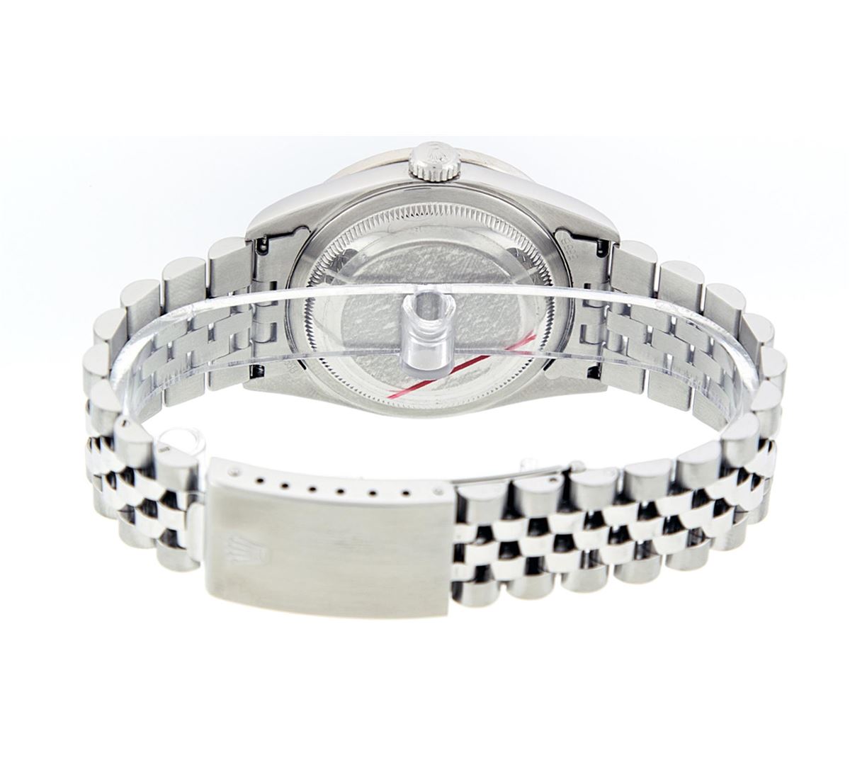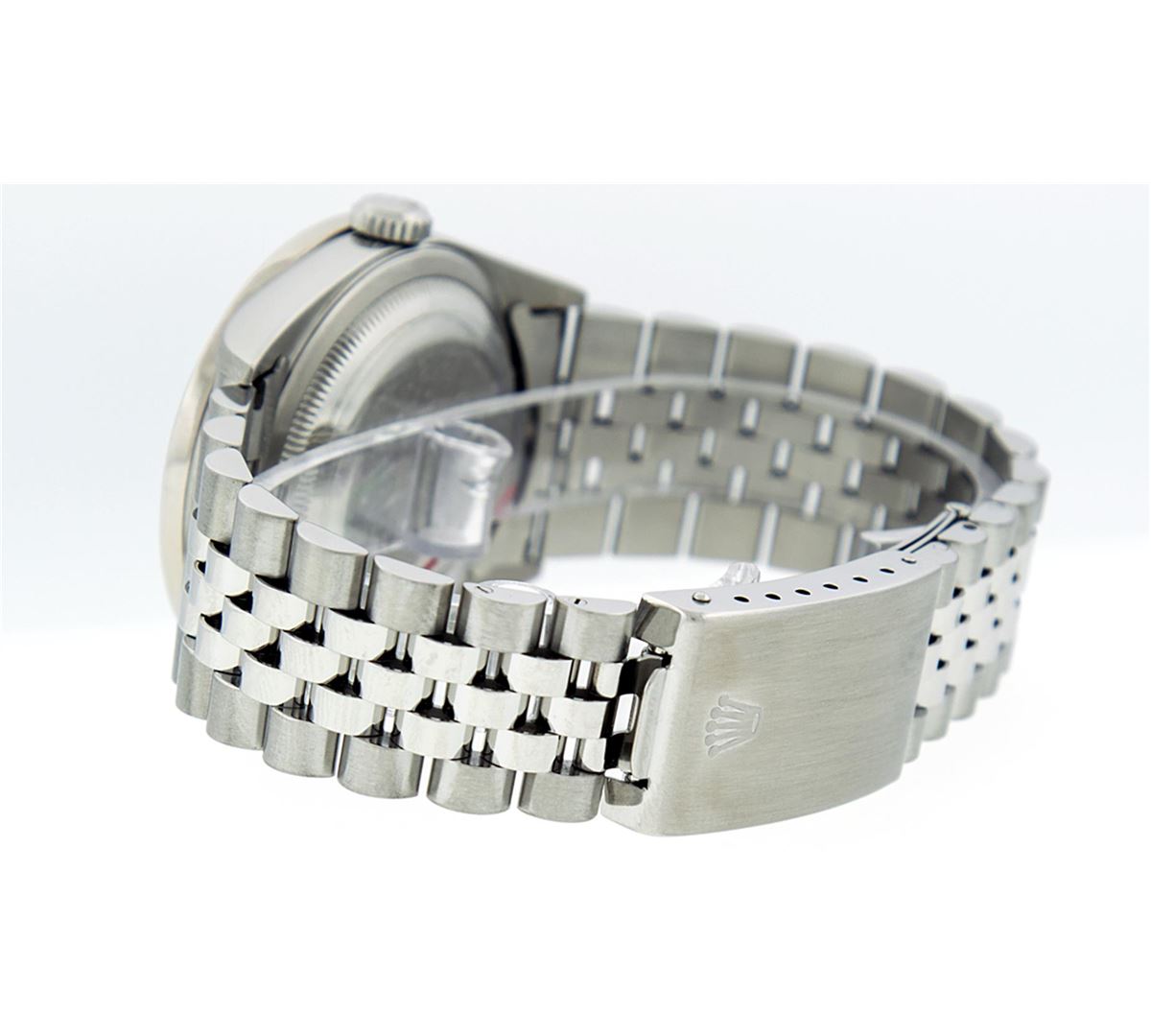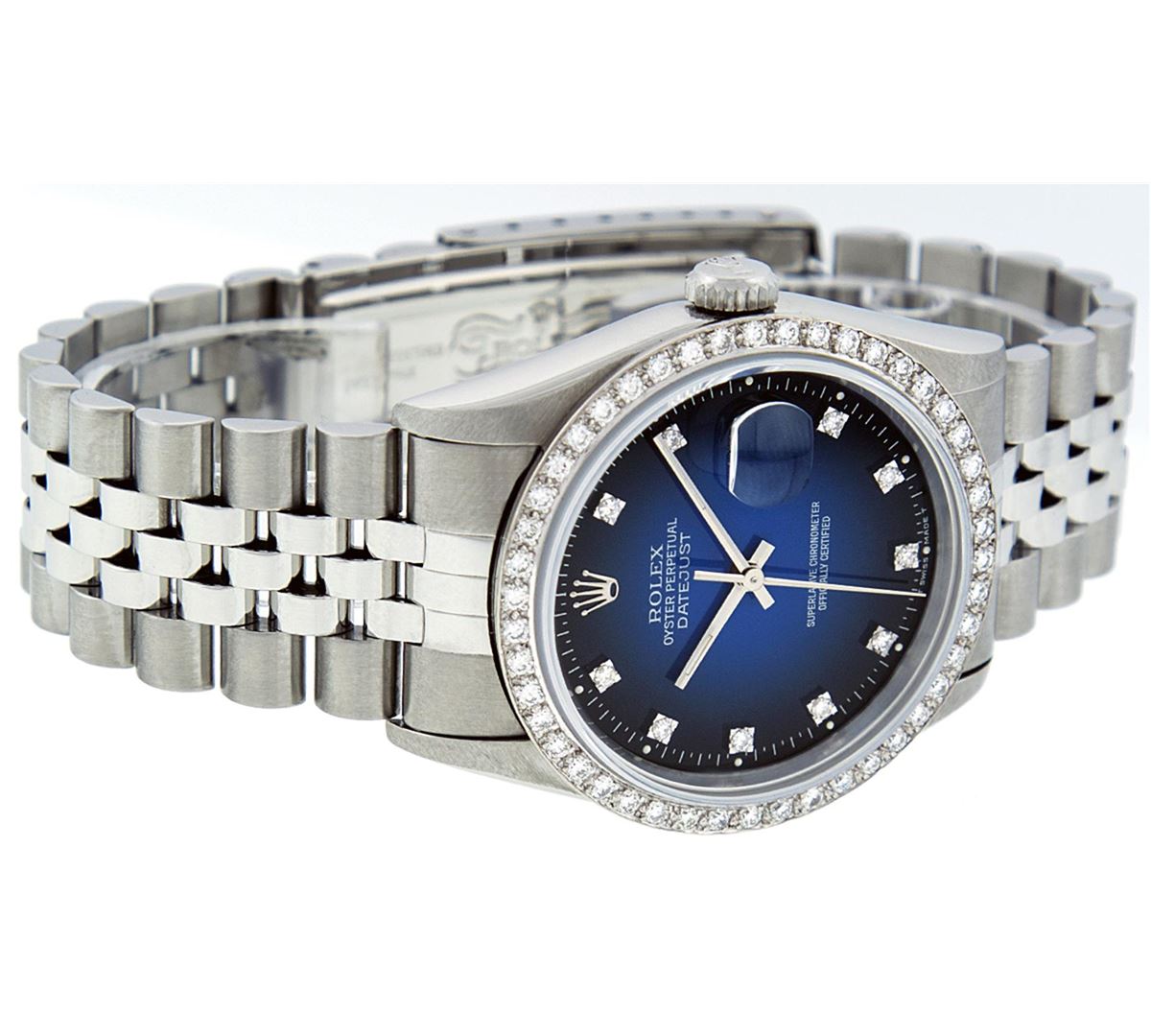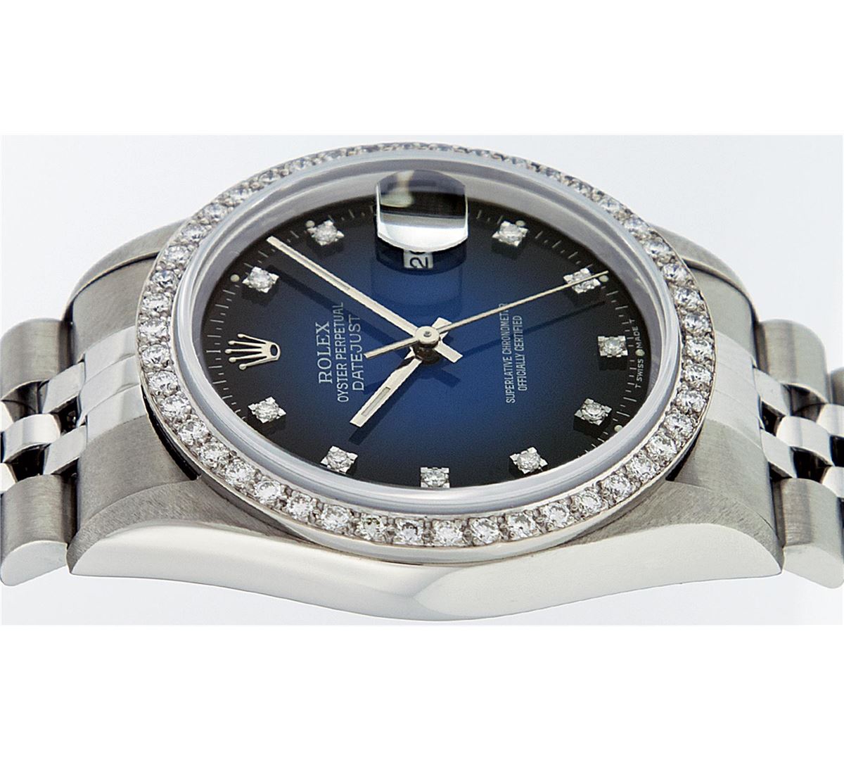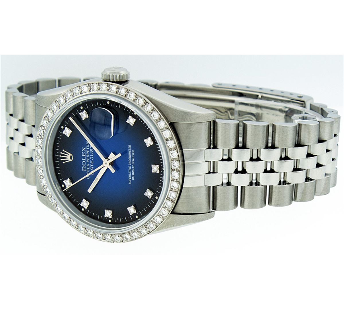 One Mens Stainless Steel Rolex Datejust Polished Bright with Satin Finish, Fully Serviced & Electronically Tested, Stainless Steel Case:36mm, Stainless Steel Crown, Custom Bezel: 18K White Gold Beadset Diamond Bezel, Diamond Count: 46 Diamonds Total Weight 1.40 Carat, Clarity: SI-VS, Color: G to H. Custom Crystal: Synthetic Sapphire Cyclops Lens. Movement: Automatic Winding Movement Caliber 3035. Custom Dial: Blue Vignette Diamond With Line Track & Lumi Dots, 10 Single Cut Diamonds in Dial G To H In Color, Clarity: VVS. Date Window: 3 O'Clock Position Date Display, Quickset, Model: Datejust, Condition: G-6 Extra Fine. Bracelet: Stainless Steel Jubilee. Bright Polish & Satin Finish. 7.0 Inch Length, Adjustable. Standard Clasp, With Rolex Logo.