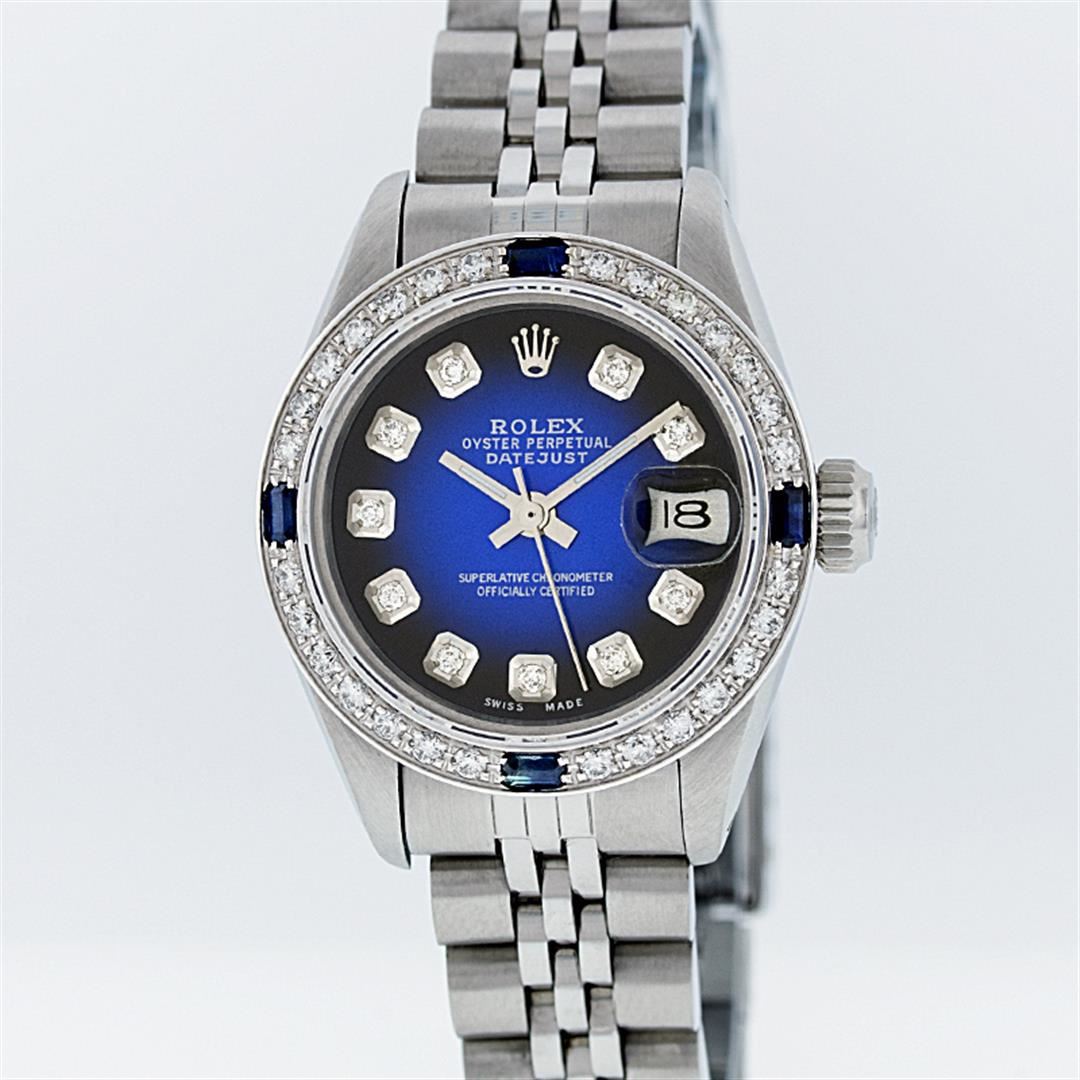 Ladies Rolex Datejust Polished Bright with Satin Finish, Serviced & Electronically Tested, Stainless Steel Case:26mm, Stainless Steel Crown, Custom Bezel: 18K White Gold Sapphire Beadset Diamond Bezel, Diamond + Gem Count: 28 Diamonds + 4 Sapphires Total Weight .70 Carat, Clarity: SI-VS, Color: G to H. Custom Crystal: Synthetic Sapphire Cyclops Lens. Movement: Automatic Winding Movement Caliber 2030. Custom Dial: Refinished Blue Vignette With Diamond Hour Markers. Date Window: 3 O'Clock Position Date Display, Model: 6917 Condition: G-6 Extra Fine. Bracelet: Stainless Steel Jubilee. Bright Polish & Satin Finish. 5.5 Inch Length, Adjustable. Standard Clasp, With Rolex Logo.