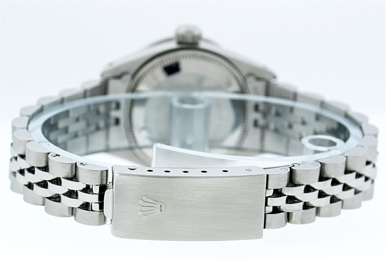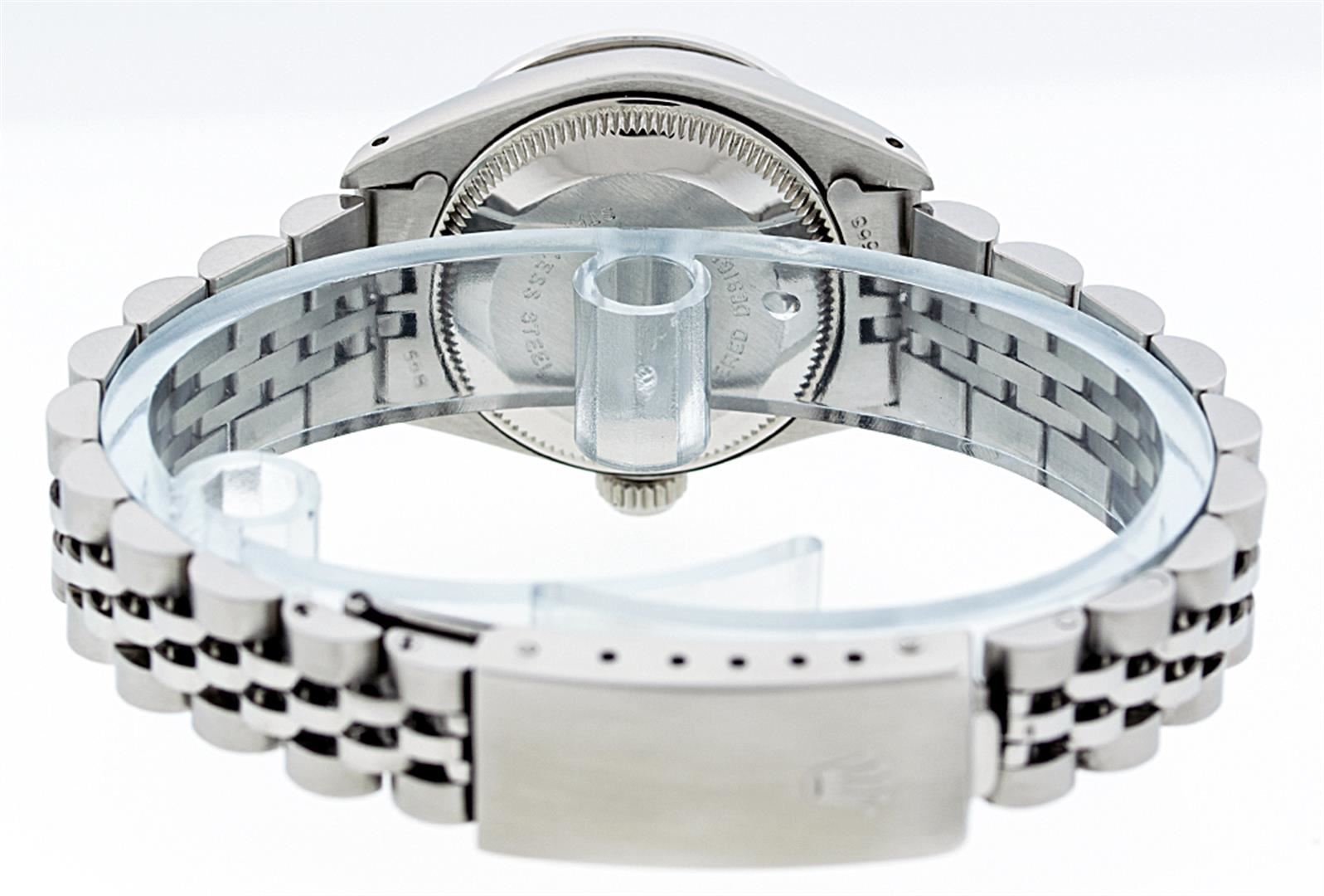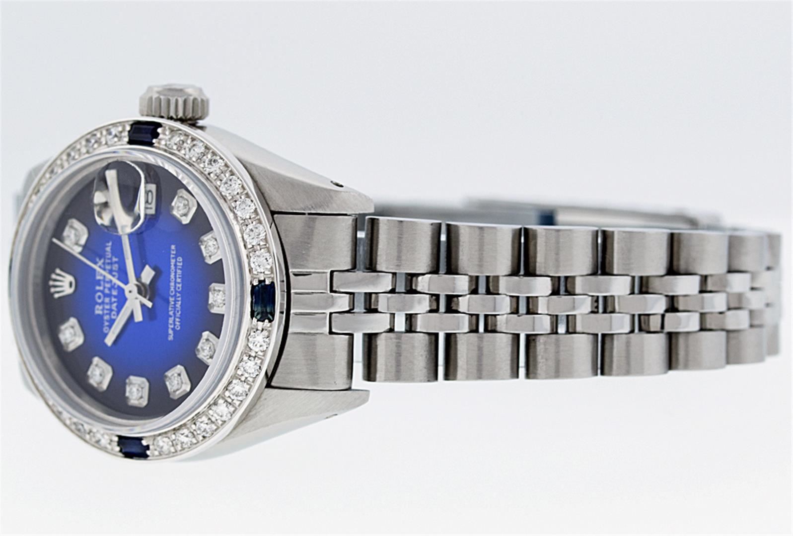 Ladies Rolex Datejust Polished Bright with Satin Finish, Serviced & Electronically Tested, Stainless Steel Case:26mm, Stainless Steel Crown, Custom Bezel: 18K White Gold Sapphire Beadset Diamond Bezel, Diamond + Gem Count: 28 Diamonds + 4 Sapphires Total Weight .70 Carat, Clarity: SI-VS, Color: G to H. Custom Crystal: Synthetic Sapphire Cyclops Lens. Movement: Automatic Winding Movement Caliber 2030. Custom Dial: Refinished Blue Vignette With Diamond Hour Markers. Date Window: 3 O'Clock Position Date Display, Model: 6917 Condition: G-6 Extra Fine. Bracelet: Stainless Steel Jubilee. Bright Polish & Satin Finish. 5.5 Inch Length, Adjustable. Standard Clasp, With Rolex Logo.