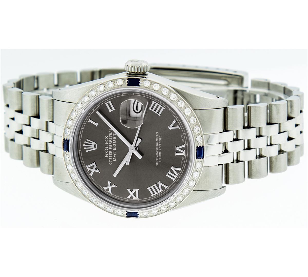 One Mens Rolex Datejust Polished Bright with Satin Finish, Serviced & Electronically Tested, Stainless Steel Case:36mm, Stainless Steel Crown, Custom Bezel: 18K White Gold Sapphire Beadset Diamond Bezel, Diamond + Gem Count: 36 Diamonds + 4 Sapphires. Total Weight 1.00 Carat, Clarity: Si-VS, Color: G to H. Custom Crystal: Synthetic Sapphire Cyclops Lens. Movement: Automatic Winding Movement Caliber 3035. Custom Dial: Dark Rhodium Roman Dial With Square Track. Date Window: 3 O'Clock Position Date Display, Quickset, Model: Datejust. Condition: G-6 Extra Fine. Bracelet: Stainless Steel Jubilee. Bright Polish & Satin Finish. 7.0 Inch Length, Adjustable. Standard Clasp, With Rolex Logo. Comes with a 6 month warranty card.