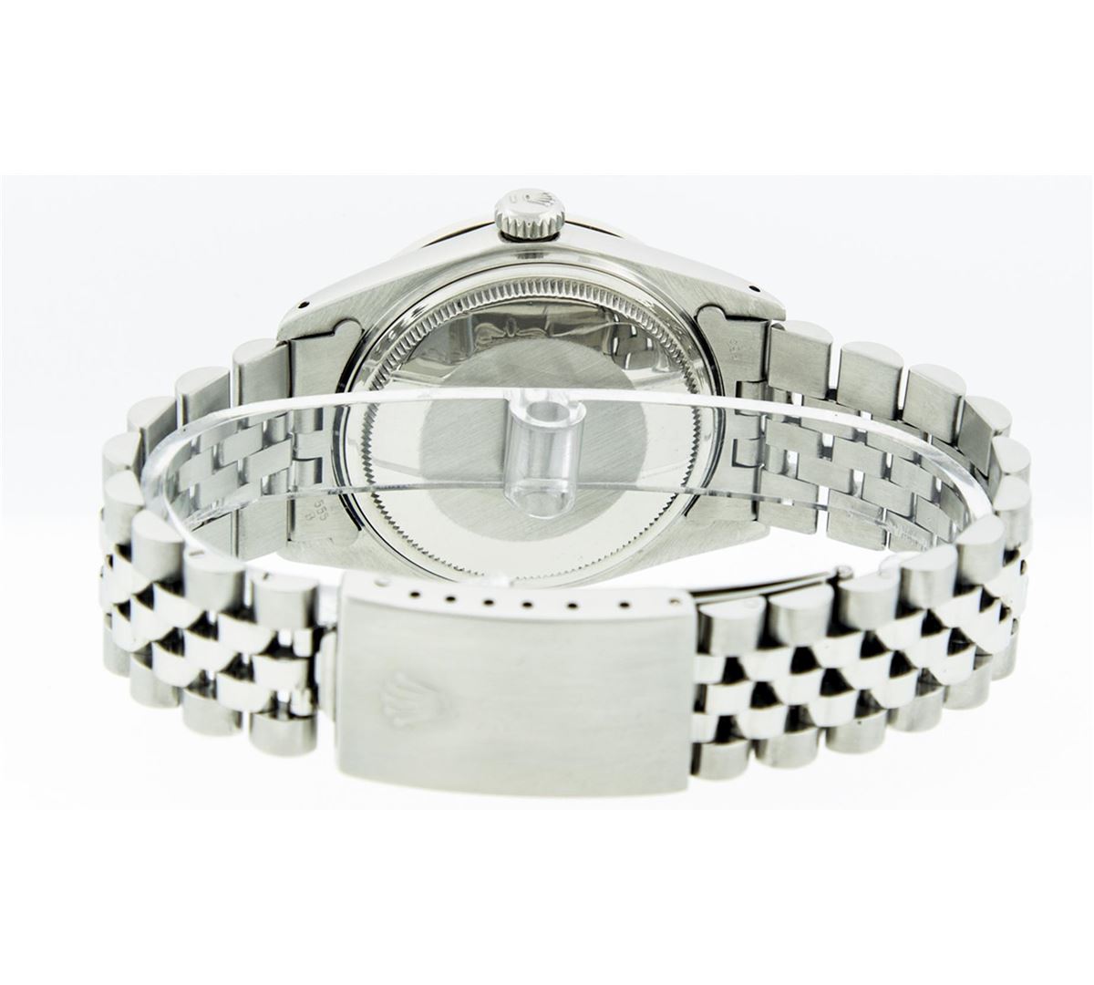 One Mens Rolex Datejust Polished Bright with Satin Finish, Serviced & Electronically Tested, Stainless Steel Case:36mm, Stainless Steel Crown, Custom Bezel: 18K White Gold Sapphire Beadset Diamond Bezel, Diamond + Gem Count: 36 Diamonds + 4 Sapphires. Total Weight 1.00 Carat, Clarity: Si-VS, Color: G to H. Custom Crystal: Synthetic Sapphire Cyclops Lens. Movement: Automatic Winding Movement Caliber 3035. Custom Dial: Dark Rhodium Roman Dial With Square Track. Date Window: 3 O'Clock Position Date Display, Quickset, Model: Datejust. Condition: G-6 Extra Fine. Bracelet: Stainless Steel Jubilee. Bright Polish & Satin Finish. 7.0 Inch Length, Adjustable. Standard Clasp, With Rolex Logo. Comes with a 6 month warranty card.