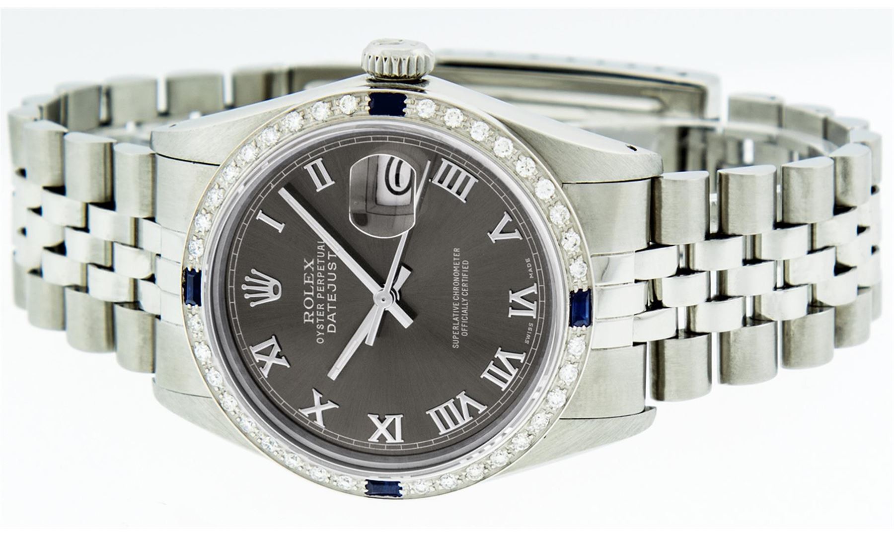 One Mens Rolex Datejust Polished Bright with Satin Finish, Serviced & Electronically Tested, Stainless Steel Case:36mm, Stainless Steel Crown, Custom Bezel: 18K White Gold Sapphire Beadset Diamond Bezel, Diamond + Gem Count: 36 Diamonds + 4 Sapphires. Total Weight 1.00 Carat, Clarity: Si-VS, Color: G to H. Custom Crystal: Synthetic Sapphire Cyclops Lens. Movement: Automatic Winding Movement Caliber 3035. Custom Dial: Dark Rhodium Roman Dial With Square Track. Date Window: 3 O'Clock Position Date Display, Quickset, Model: Datejust. Condition: G-6 Extra Fine. Bracelet: Stainless Steel Jubilee. Bright Polish & Satin Finish. 7.0 Inch Length, Adjustable. Standard Clasp, With Rolex Logo. Comes with a 6 month warranty card.