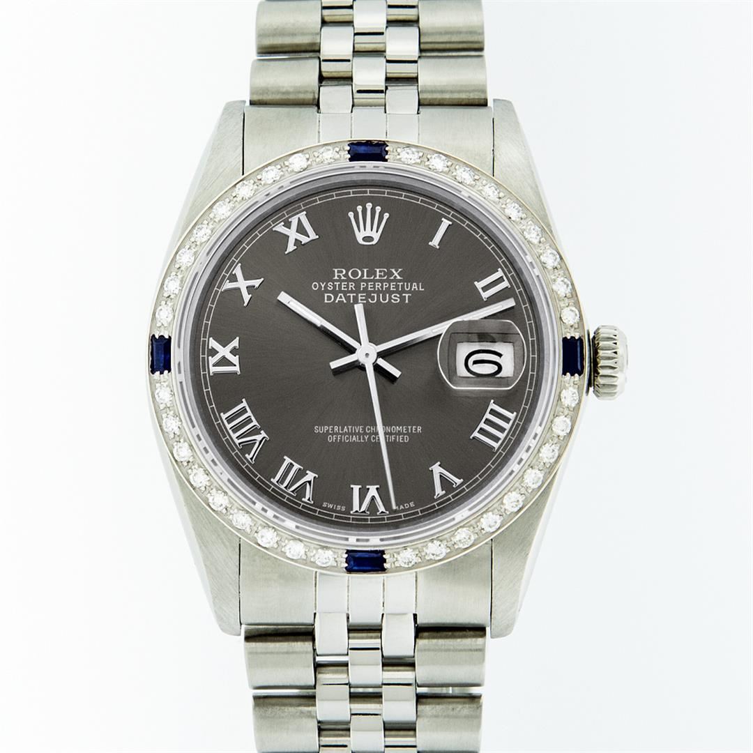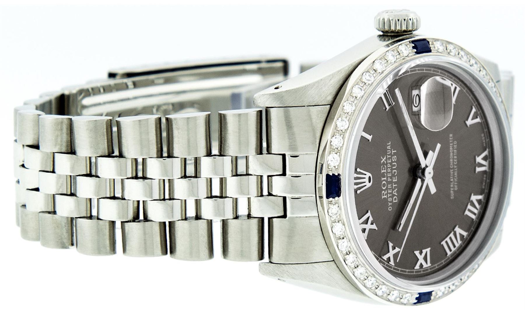 One Mens Rolex Datejust Polished Bright with Satin Finish, Serviced & Electronically Tested, Stainless Steel Case:36mm, Stainless Steel Crown, Custom Bezel: 18K White Gold Sapphire Beadset Diamond Bezel, Diamond + Gem Count: 36 Diamonds + 4 Sapphires. Total Weight 1.00 Carat, Clarity: Si-VS, Color: G to H. Custom Crystal: Synthetic Sapphire Cyclops Lens. Movement: Automatic Winding Movement Caliber 3035. Custom Dial: Dark Rhodium Roman Dial With Square Track. Date Window: 3 O'Clock Position Date Display, Quickset, Model: Datejust. Condition: G-6 Extra Fine. Bracelet: Stainless Steel Jubilee. Bright Polish & Satin Finish. 7.0 Inch Length, Adjustable. Standard Clasp, With Rolex Logo. Comes with a 6 month warranty card.