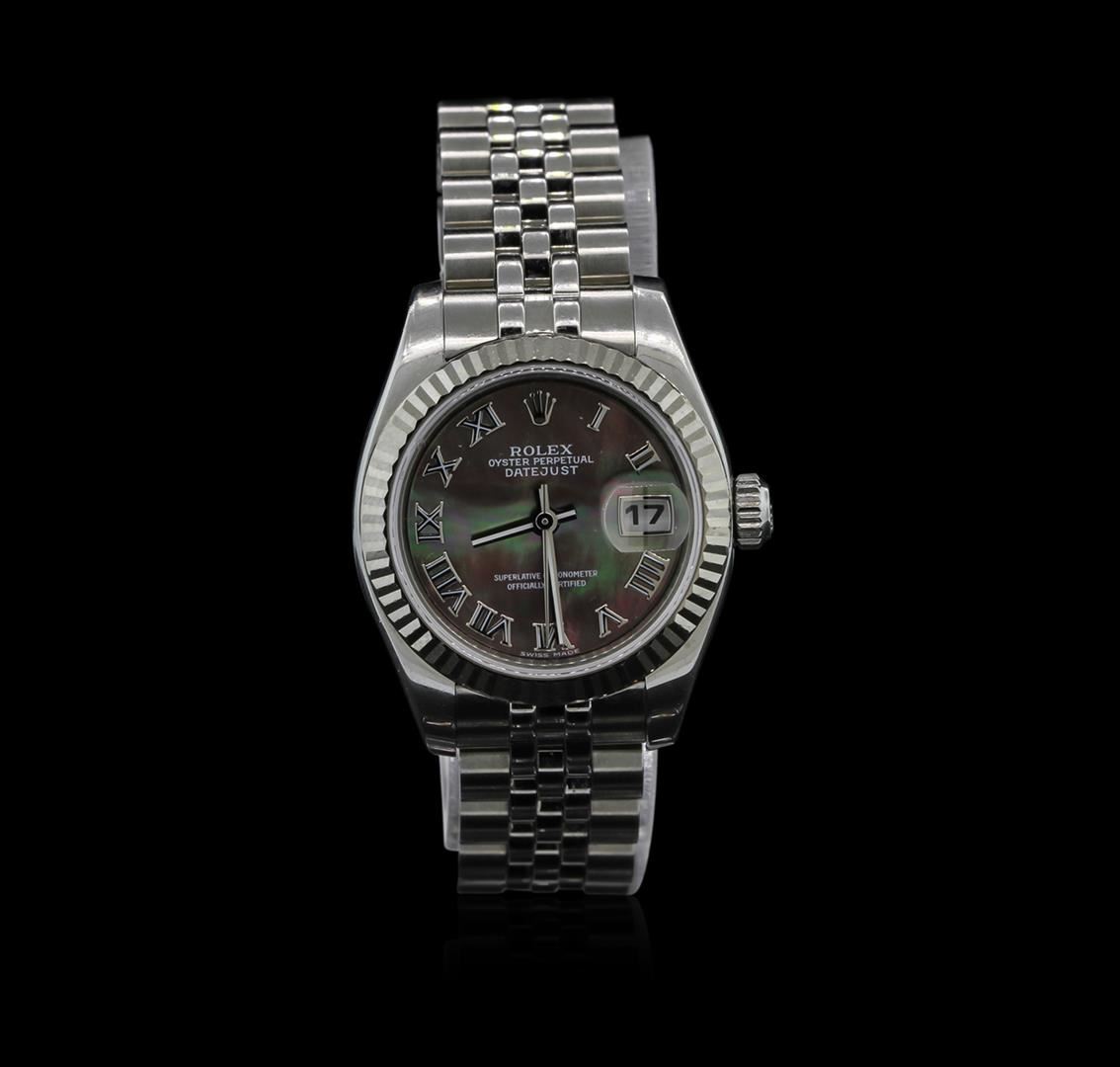 One ladies, hand crafted & machine milled Rolex DateJust Model stainless steel wristwatch electronically tested, Case: 26mm oyster, Crown: twinlock with logo, Bezel: 18KT White gold fluted, Crystal: synthetic sapphire cyclops lens. Movement: superlative chronometer, Dial: Dark mother of pearl, with baton hands, & raised Roman numerals, Calendar: 3 o'clock position date display, quick set, Circa: 2005, Condition: G-7 Near Mint. Bracelet: stainless steel jubilee. Bright polish and brushed finish. Six and one half inch length, adjustable. Concealed clasp, with logo. Total Weight of Watch 66.37gm. AIG Appraised at $8,050.00.